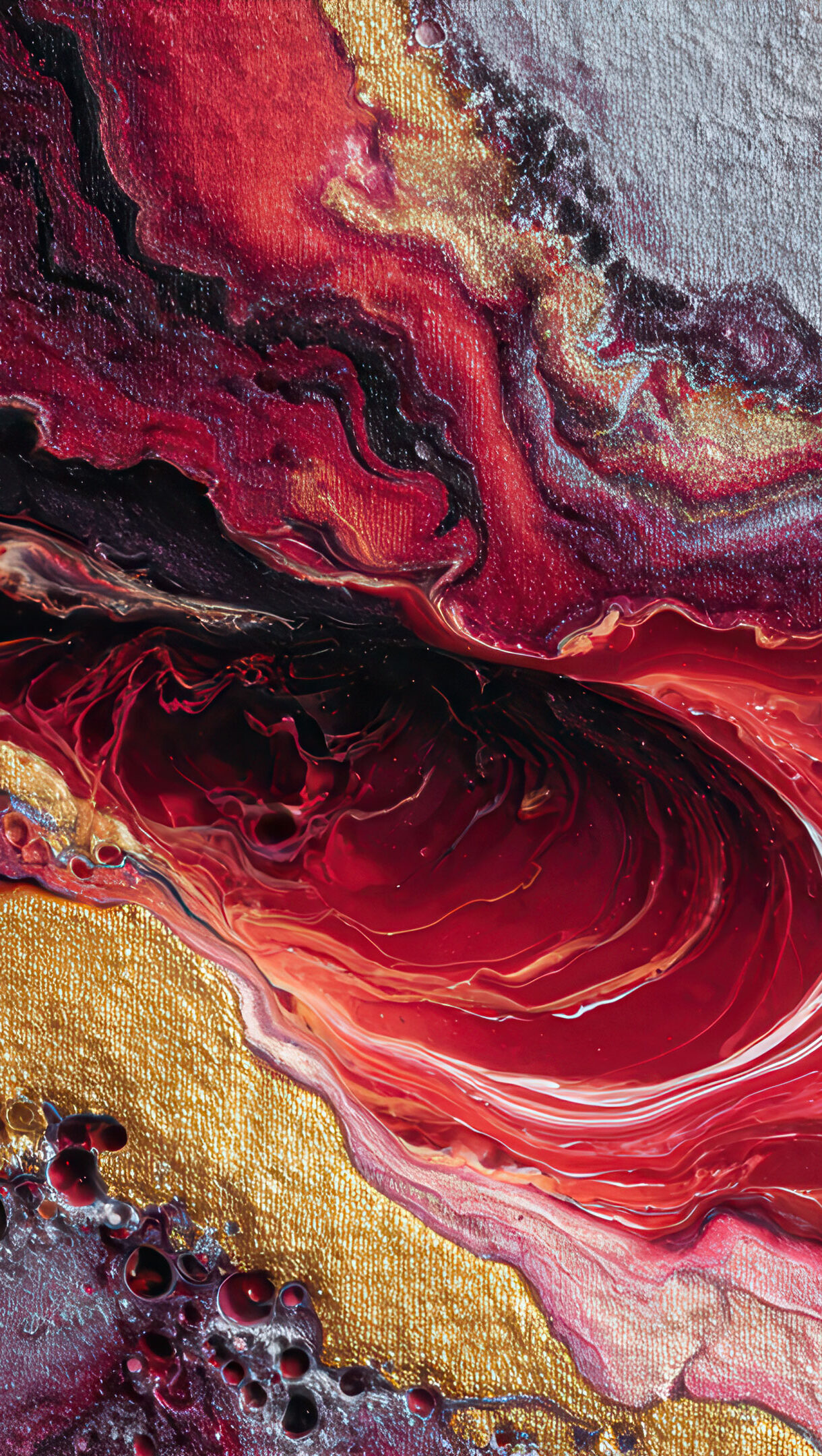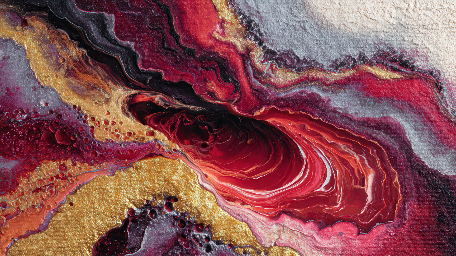A dynamic 4K wallpaper presenting an abstract fluid art painting with swirls of metallic red, gold, and silver across the canvas. Glossy rivers of deep red and metallic silver flow alongside areas of textured, shimmering gold and dark purples, creating a powerful, molten aesthetic.