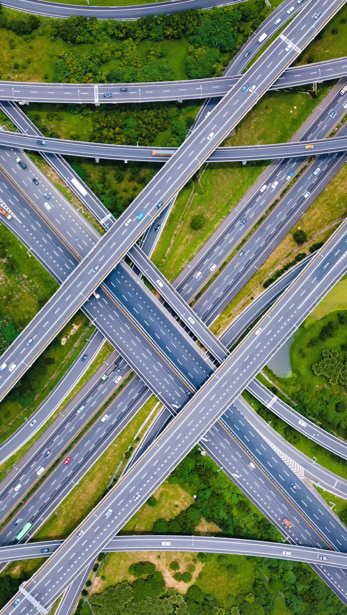 An intricate 4K wallpaper showcasing an aerial view of a sprawling highway interchange in Taipei, Taiwan, where numerous elevated roads weave across a vibrant green landscape. Vehicles move steadily along the complex network of grey asphalt, creating a dynamic visual interplay with the surrounding lush natural environment.