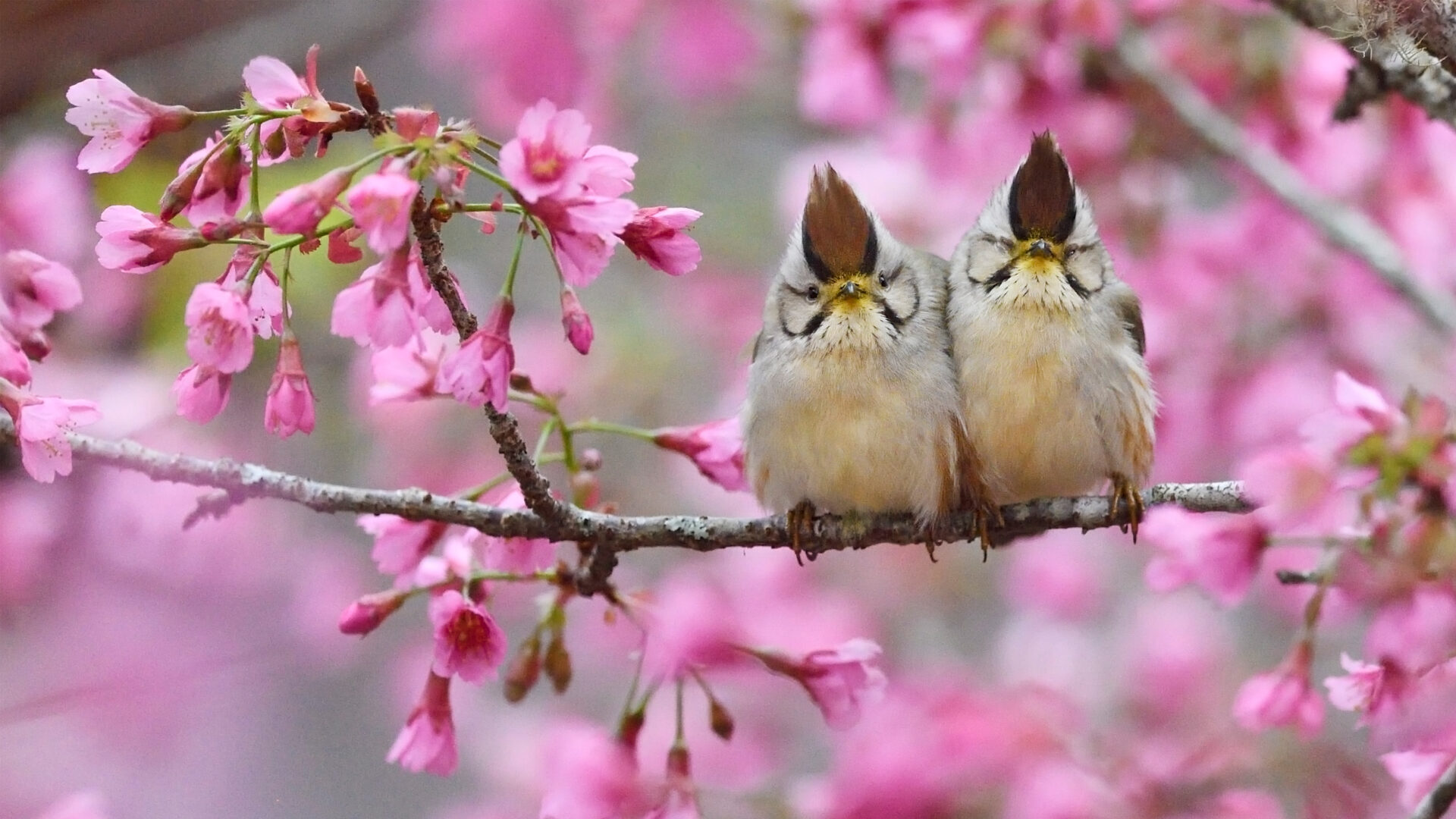 A captivating 4K wallpaper showcases a pair of Taiwan Yuhina birds nestled on a branch surrounded by blooming cherry blossoms in Alishan, Taiwan. The birds' detailed brown crests and soft cream plumage are beautifully framed by the surrounding delicate pink petals, creating a serene and enchanting spring scene.
