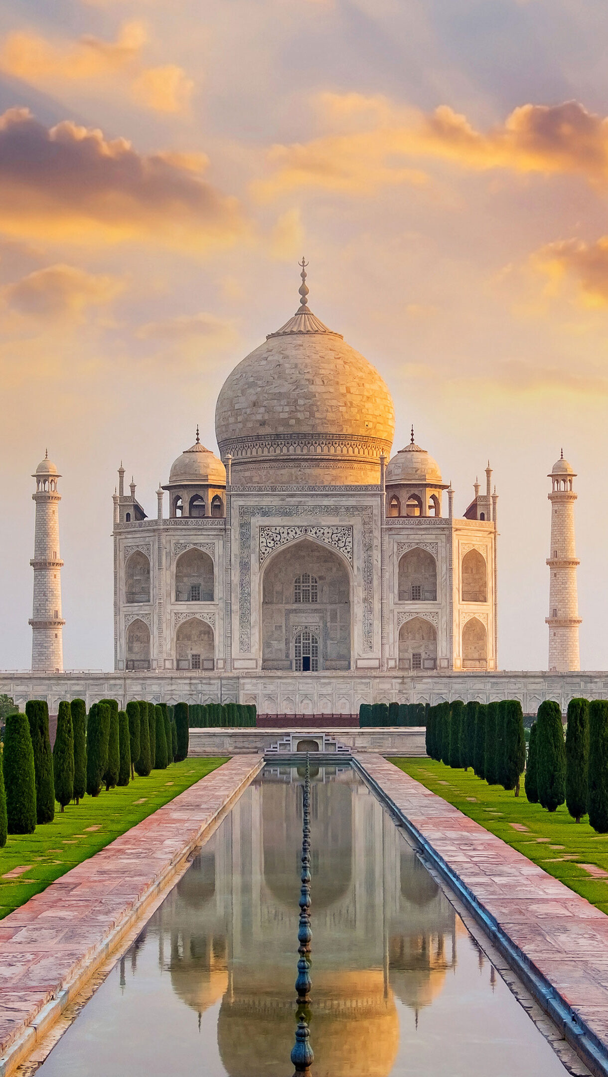 A breathtaking 4K wallpaper showcases the majestic Taj Mahal in Agra, India, presiding over symmetrical gardens and a long reflecting pool at sunset. The white marble structure glows subtly under a sky painted with warm oranges and soft purples, perfectly mirrored in the still water below, enhancing its serene and timeless beauty.