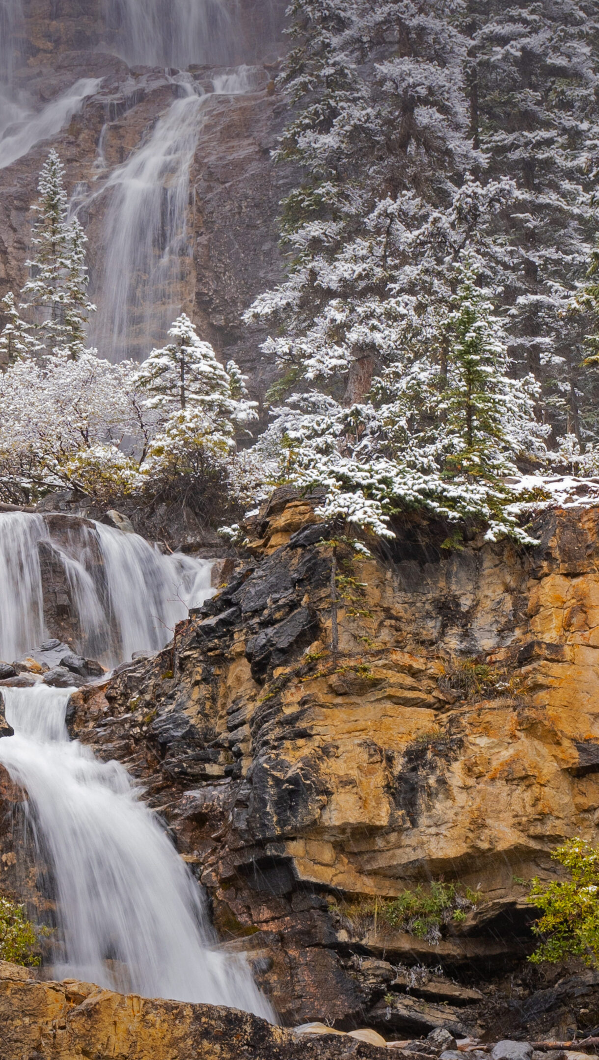 A breathtaking 4K wallpaper capturing Tangle Creek Falls cascading through a snow-covered winter landscape in Jasper National Park, Alberta, Canada. Silky white water tumbles over rugged, golden-brown rock formations, flanked by dark green pine trees heavy with fresh white snow, creating a serene yet powerful winter scene.
