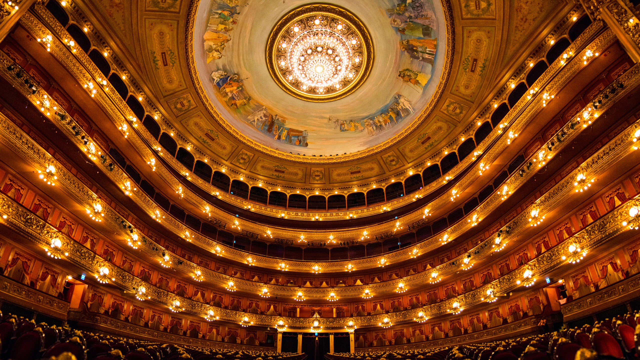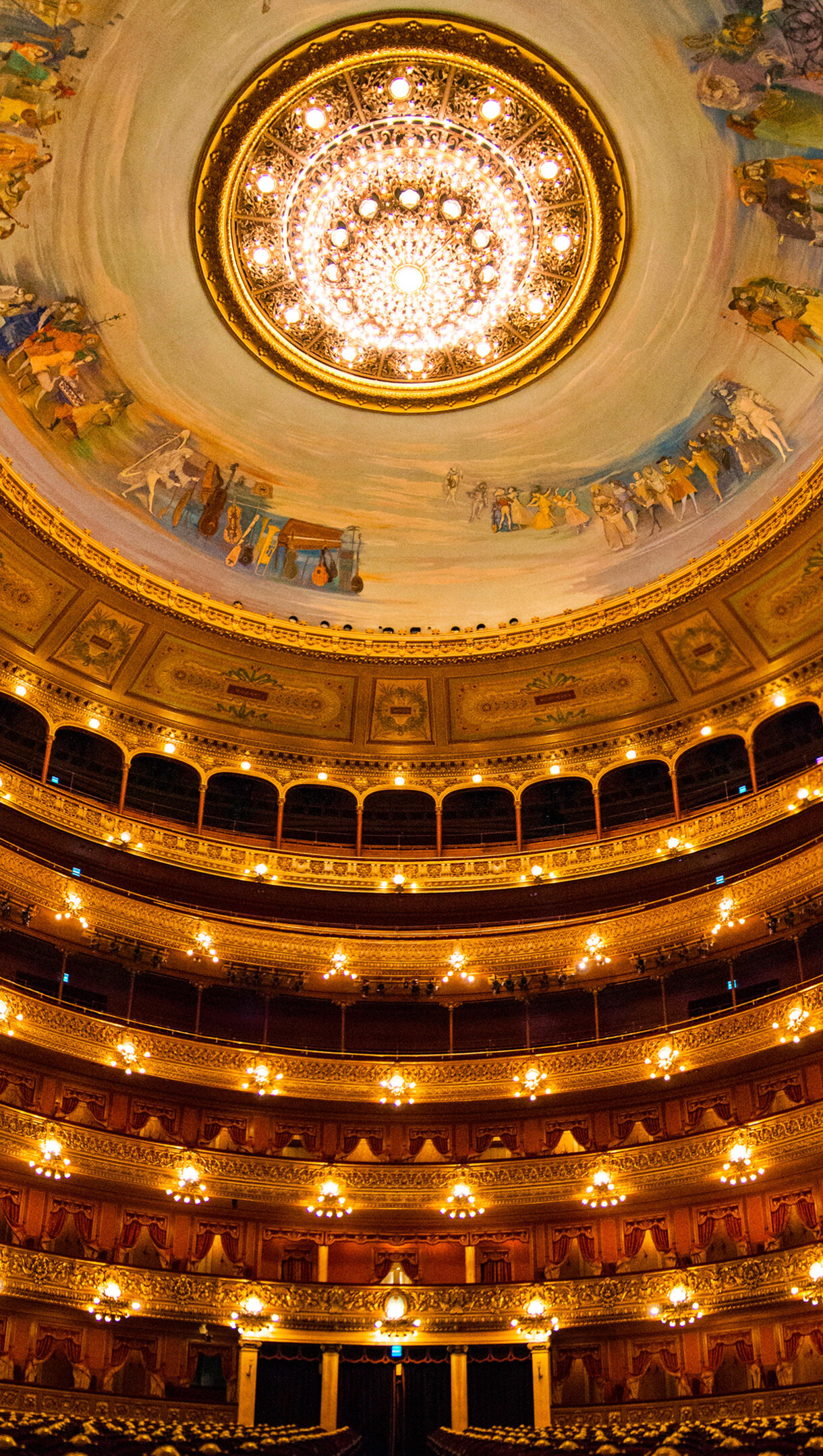 A captivating 4K wallpaper showcases the grand interior of the Teatro Colón in Buenos Aires, Argentina, with its semicircular tiers of ornate private boxes ascending towards a magnificent central chandelier. The dazzling chandelier and countless smaller lights on each tier cast a warm, golden glow across the intricate gold leaf decorations and the beautifully painted ceiling fresco, highlighting the venue's opulent and timeless grandeur.