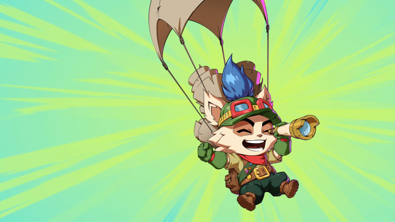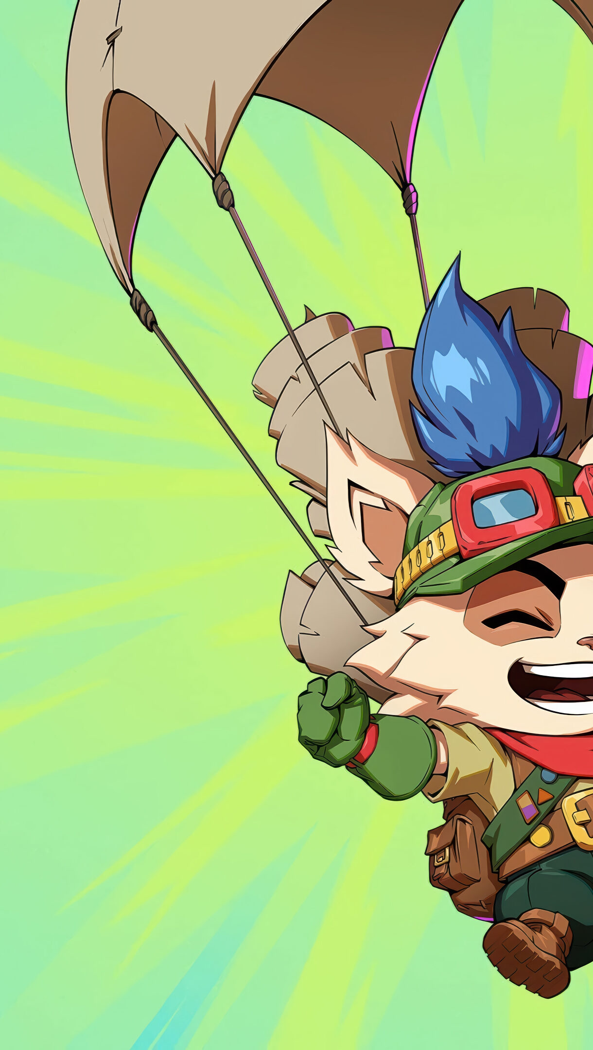 A vibrant 4K wallpaper showcasing Teemo, the mischievous Yordle, joyfully parachuting against a dynamic green-to-teal background with radiating light rays. He grins widely, looking through a spyglass, celebrating a triumphant 2xKO in an adventurous mood.