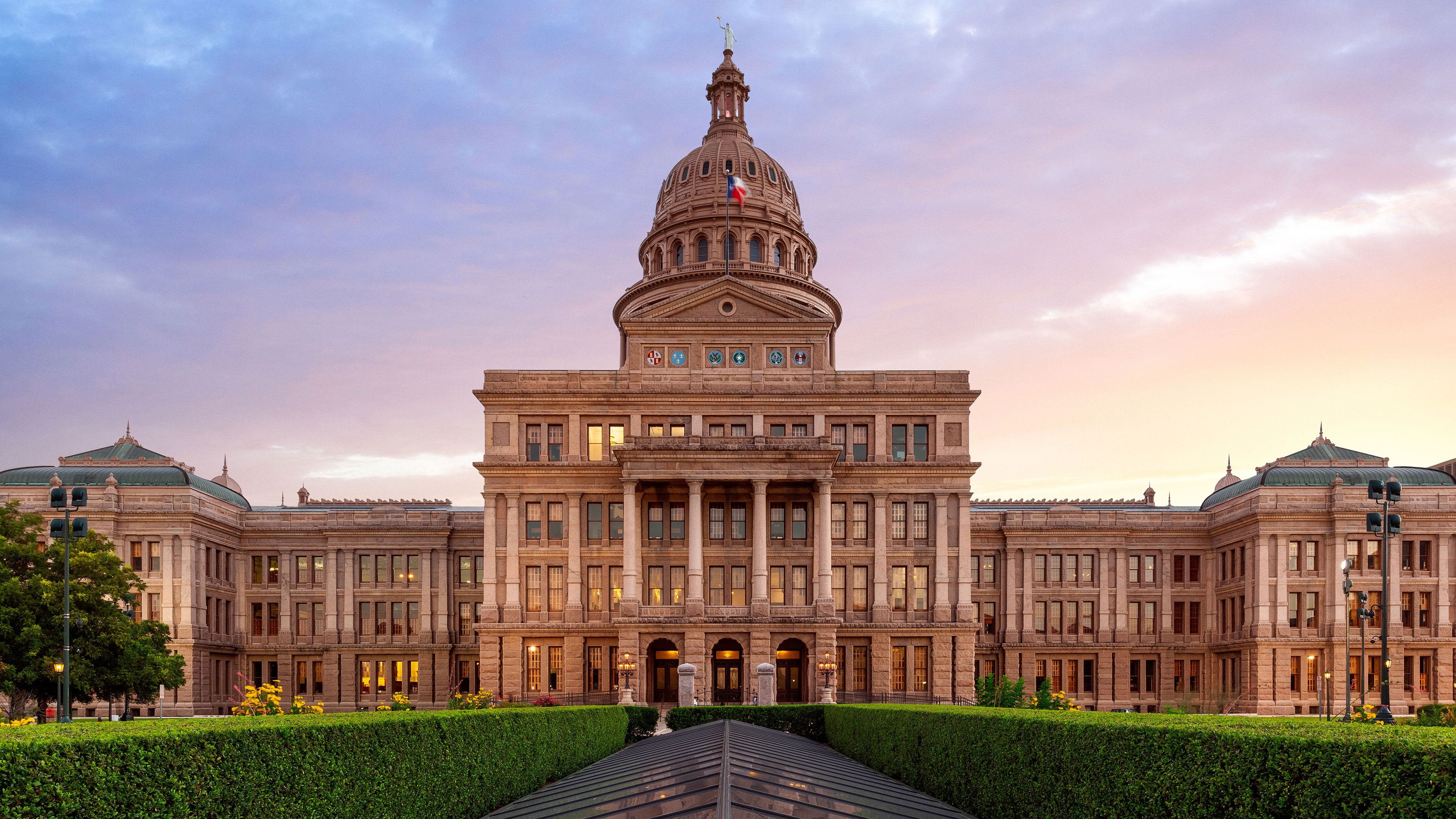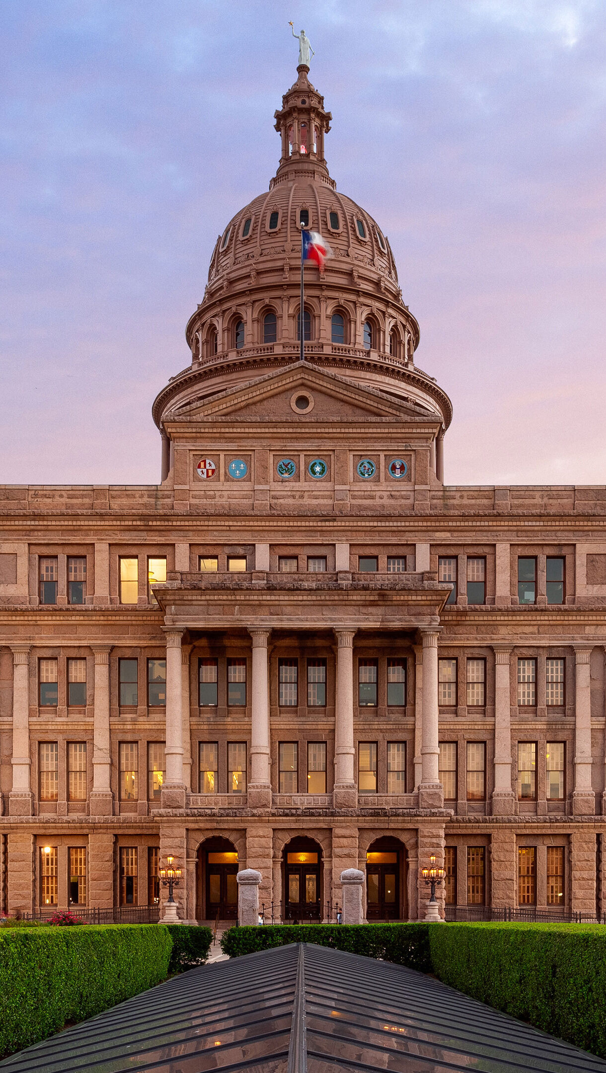 A grand 4K wallpaper captures the Texas State Capitol in Austin, majestically centered amidst its manicured grounds at dusk. The building's warm stone facade glows against a dramatic sunset sky, transitioning from soft lavender to golden hues, creating a serene and timeless atmosphere.