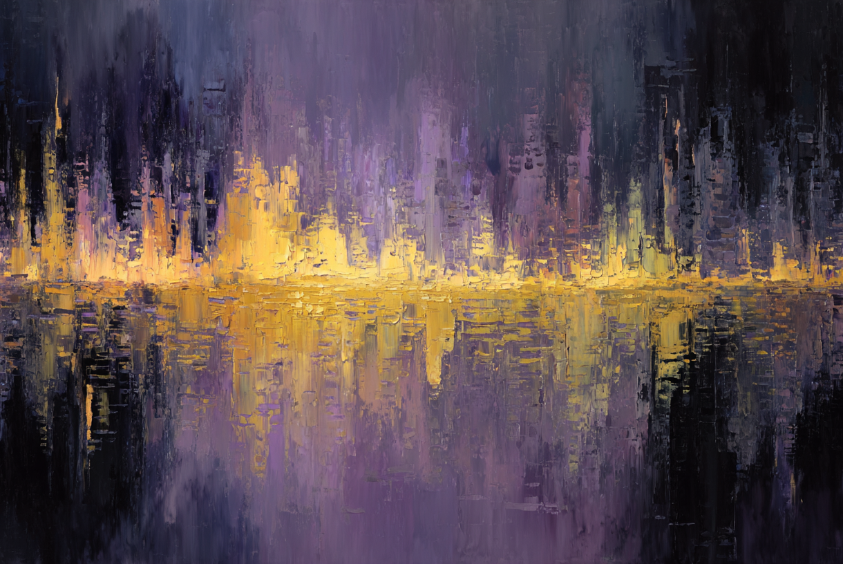 A captivating 4K wallpaper presents a textured abstract city skyline, vibrant with golden light, reflecting across a dark, purple-hued body of water. Thick impasto brushstrokes create a dynamic interplay between the brilliant gold lights of the city above and their shimmering, fractured reflections in the deep purple and black water below, defining a dramatic and moody urban scene.