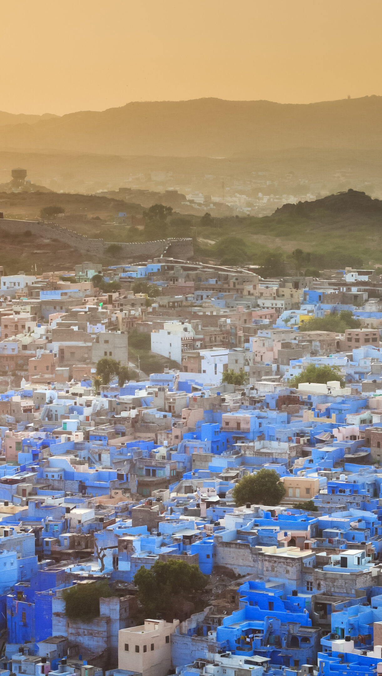 A captivating 4K wallpaper showcasing an aerial view of the Blue City of Jodhpur, India, spread across a landscape of hills. The city's distinctive indigo-painted buildings are bathed in the warm, golden glow of a beautiful sunset, creating a tranquil and picturesque scene.