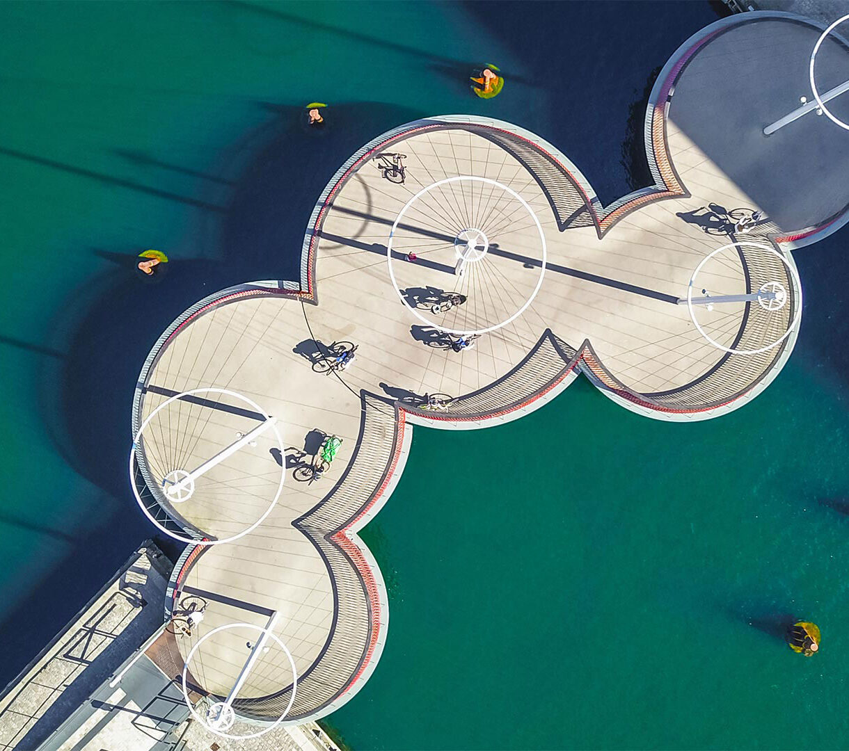 A captivating 4K wallpaper presents an aerial view of Copenhagen, Denmark’s unique Circle Bridge, where cyclists traverse its series of interlocking circular platforms over brilliant turquoise water. Strong sunlight creates striking elongated shadows of the bridge's masts and active cyclists, emphasizing the modern design and vibrant urban scene.