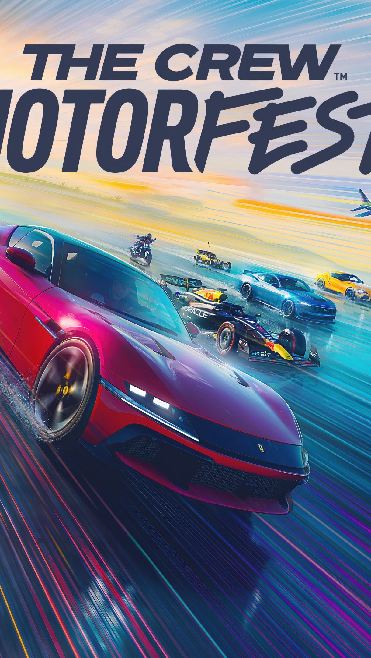 An electrifying 4K wallpaper depicting The Crew Motorfest's multi-vehicle racing, featuring a bold red sports car speeding ahead of an F1 racer, motorbike, and other cars on a vibrant, motion-blurred road. The dramatic interplay of warm sunset light and cool blue tones, streaked with intense color trails, conveys explosive speed and competitive thrill.