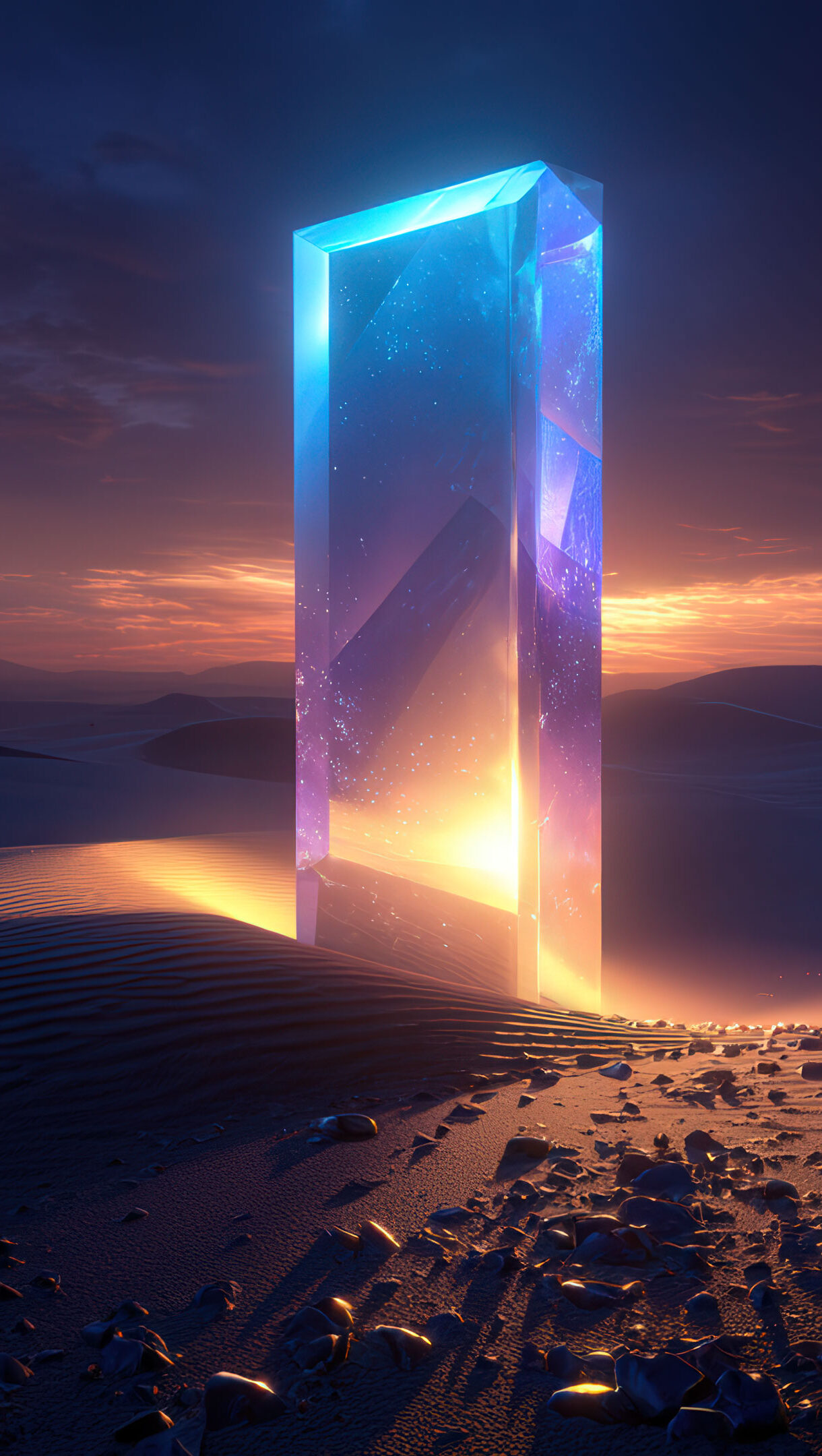 A mesmerizing digital art wallpaper featuring a giant, glowing crystal monolith standing tall in a vast desert landscape at sunset. The luminous monolith radiates with brilliant blue and purple hues, casting a warm, ethereal glow upon the surrounding sand dunes, under a dramatic, colorful sky.