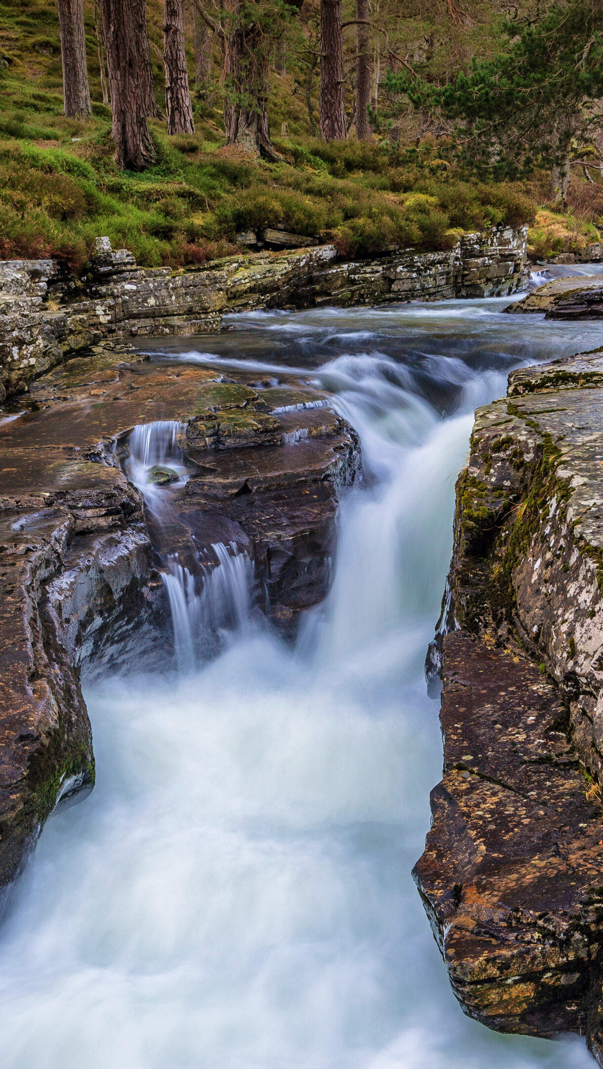 An immersive 4K wallpaper captures The Punch Bowl Waterfall on the River Quoich in the Cairngorms, Scotland, nestled within a lush forest setting. Its powerful white cascade, softened by a long exposure, dramatically plunges into dark, carved rock pools, creating a dynamic contrast with the rich, moss-covered banks and ancient pine trees.