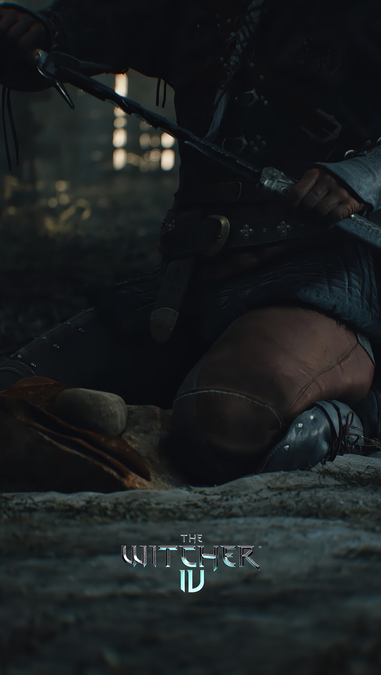 An atmospheric 4K wallpaper featuring Ciri kneeling and tending to her iconic sword within a dimly lit, rustic interior. The sword's subtle gleam and faint embers cutting through deep shadows create a somber, focused mood of preparedness for The Witcher 4.