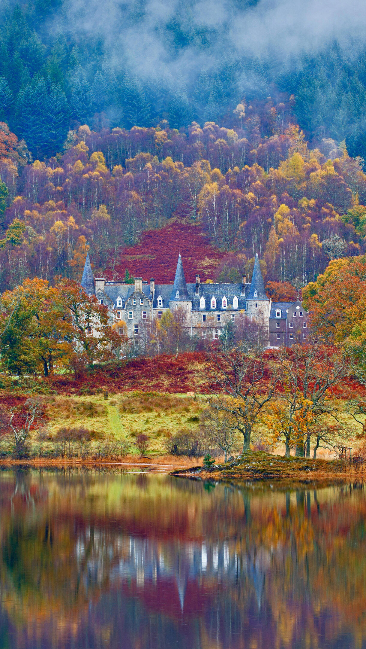 A majestic 4K wallpaper unveils the Tigh Mor Trossachs estate nestled within the stunning autumn landscape of Scotland's Loch Achray region. The vivid autumnal foliage cascades down the hills into the serene loch, its rich colors mirroring perfectly in the tranquil water under a mystical, misty sky.