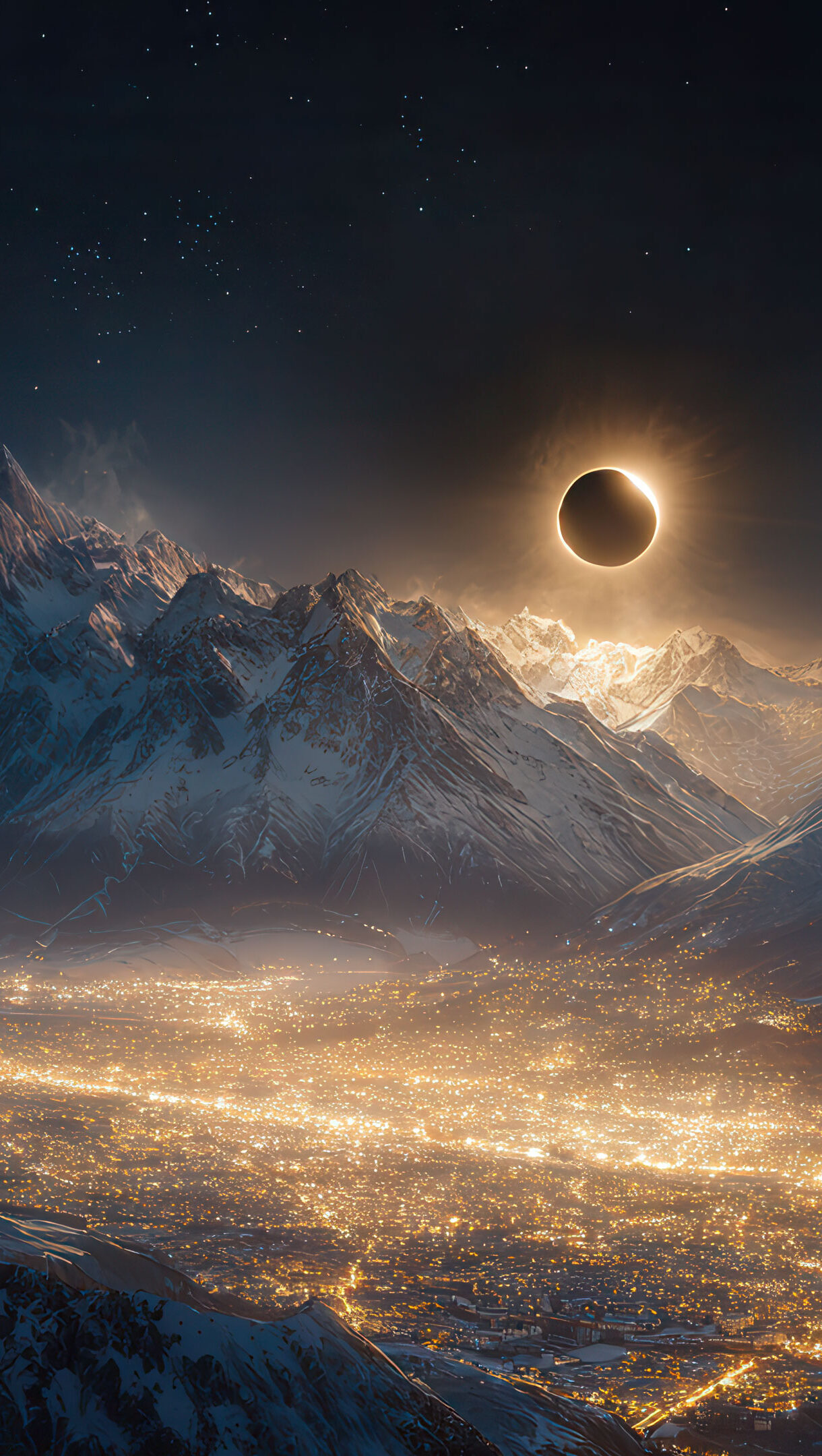 A breathtaking 4K wallpaper showcases a total solar eclipse dominating the night sky above a vast, sparkling metropolis nestled within snow-capped mountain ranges. The brilliant corona of the eclipse casts a golden glow on the surrounding peaks, while countless city lights shimmer below, creating a powerful interplay of celestial wonder and urban vibrancy.