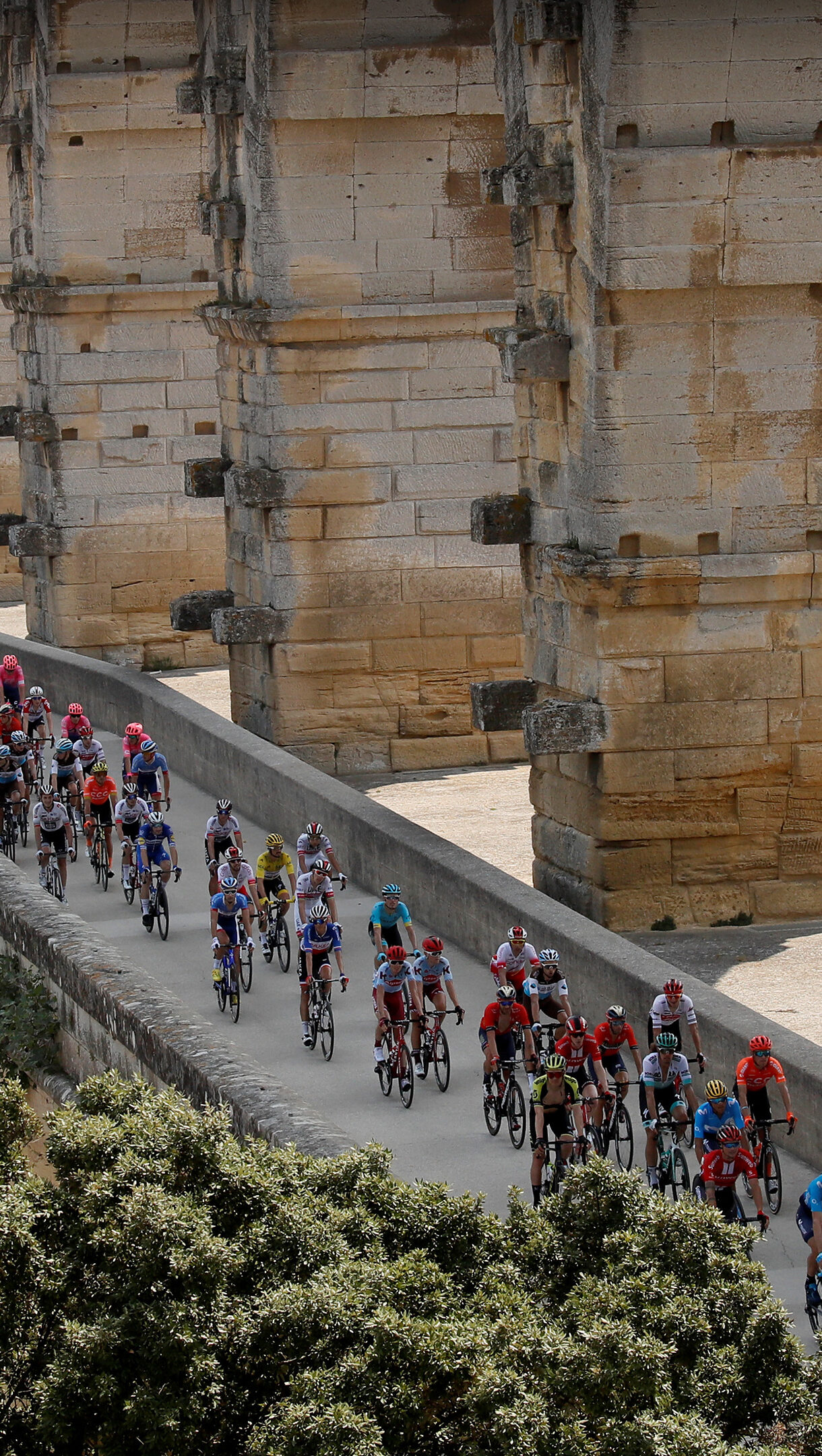 An iconic 4K wallpaper capturing a long peloton of Tour de France cyclists traversing the ancient, multi-arched Pont du Gard Aqueduct in France. The vibrant procession of riders in their colorful jerseys contrasts dramatically with the weathered, sun-drenched Roman stone and surrounding lush green landscape.
