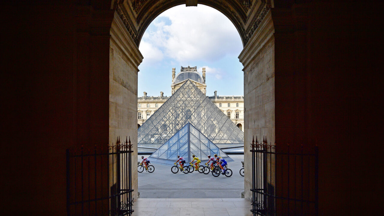 An iconic 4K wallpaper captures Tour de France cyclists riding past the distinctive Louvre Pyramid in Paris, viewed through a shadowed archway. The vibrant jerseys of the cyclists provide a dynamic contrast against the pyramid's modern glass and the historic palace architecture under a partly cloudy sky.