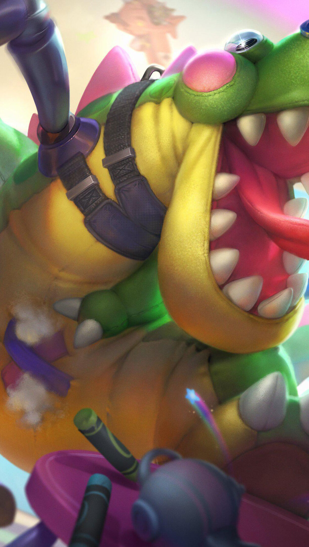 A mesmerizing 4K wallpaper unveiling the menacing presence of the Toy Terror Cho'gath skin in League of Legends. Cho'gath, the terror of the void, looms large in a playful yet eerie incarnation, exuding a sense of both whimsy and dread within the vibrant world of the game. Simply click the download button to bring this masterpiece to life on your screen as a desktop wallpaper or save it for later in your wallpaper collection.