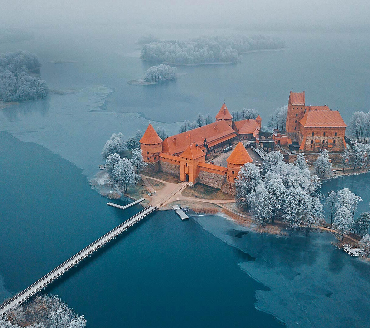 A captivating 4K wallpaper presents Trakai Island Castle Museum in a serene winter aerial view, nestled on an island amidst a partially frozen lake. Its distinctive orange-red brick structures stand in striking contrast to the frosty white trees and the cool, icy blue water, all veiled in a soft winter mist.
