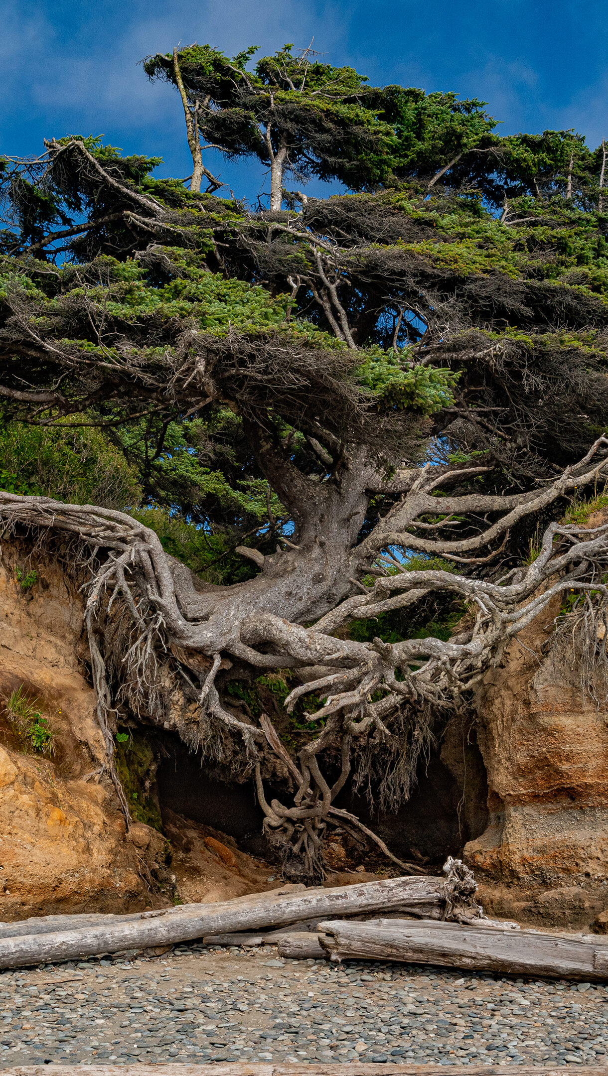 A captivating 4K wallpaper showcases the iconic Tree of Life, its dramatically exposed roots anchoring it to an eroded coastal cliff at Kalaloch Beach in Olympic National Park. Its intricate, gnarled roots elegantly drape across an undercut hollow in the sandy cliff, creating a natural cave while highlighting the tree's remarkable resilience against the elements.
