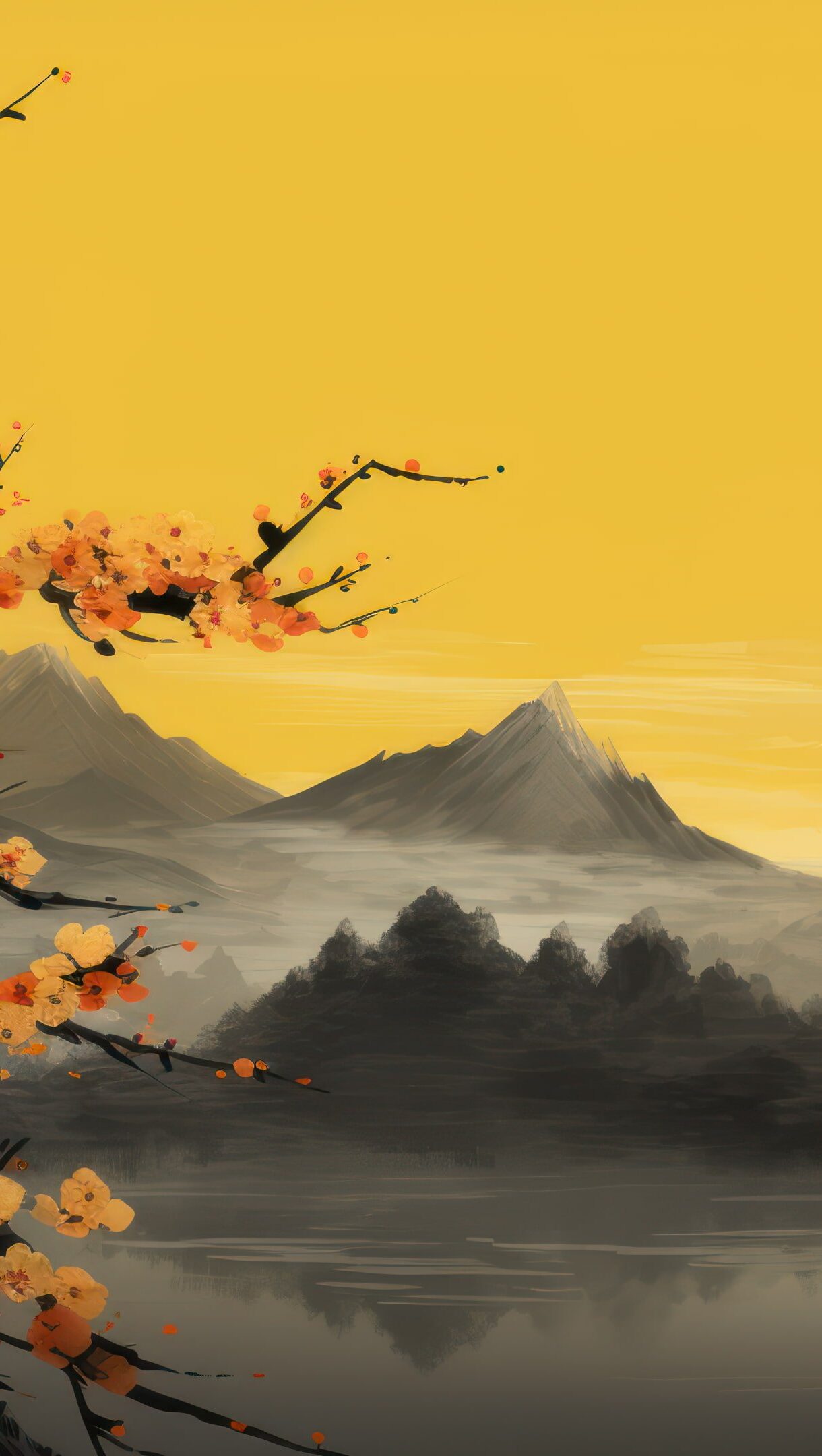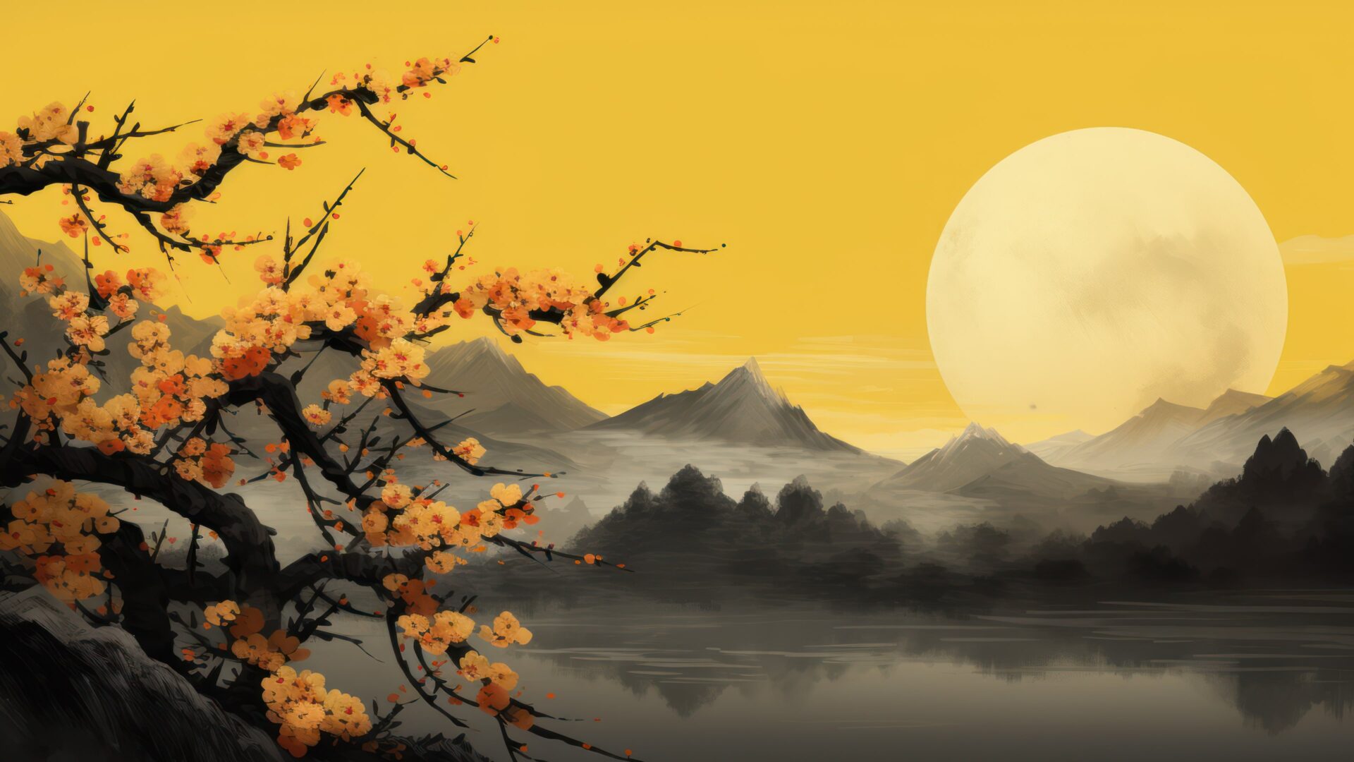 A breathtaking 4K wallpaper showcasing a beautiful Japanese painting of trees and mountains in vibrant yellow hues, crafted with the brilliance of artificial intelligence, creating a stunning piece of nature and landscape art. Simply click the download button to bring this masterpiece to life on your screen as a desktop wallpaper or save it for later in your picture collection.