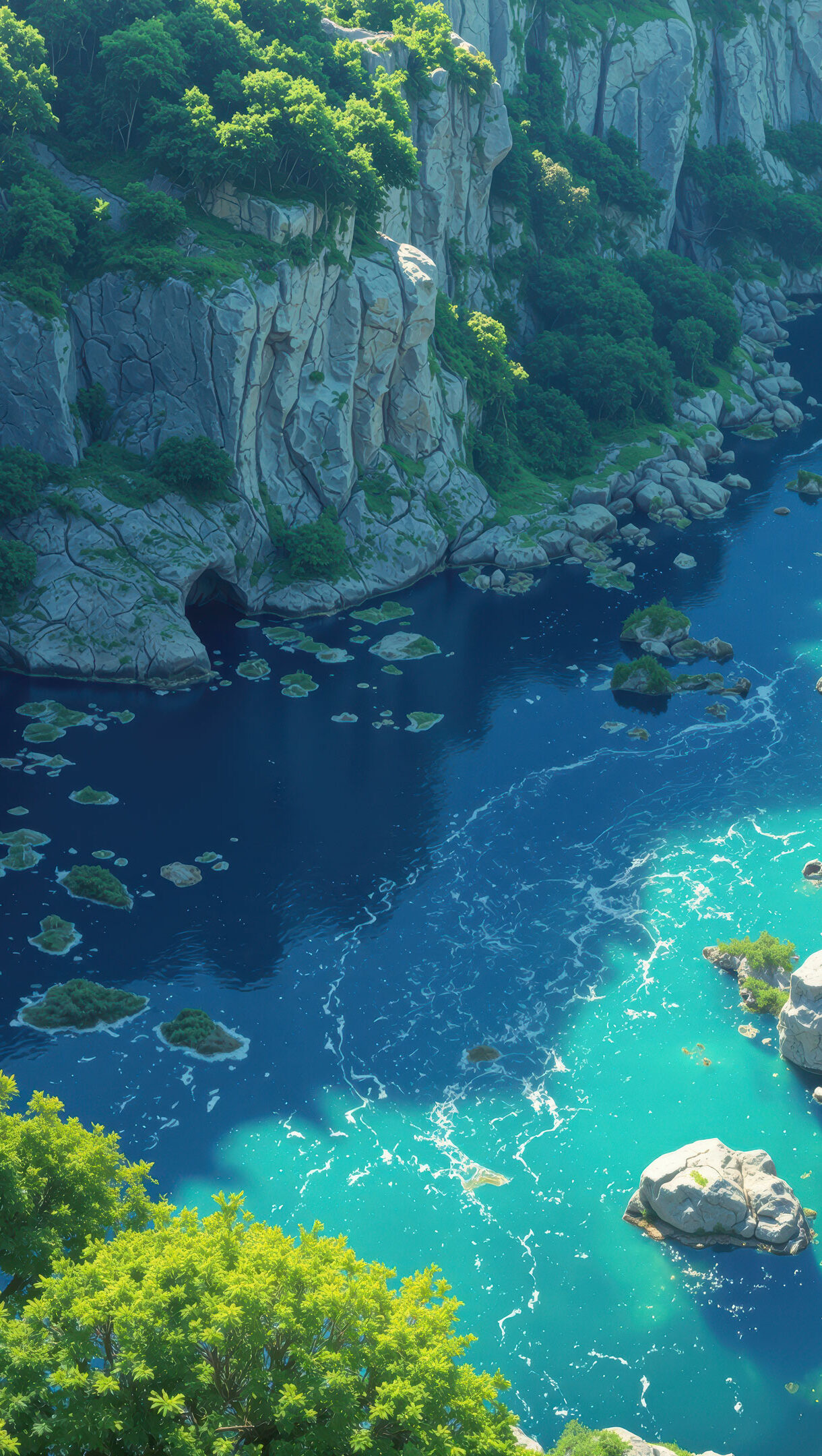 A breathtaking 4K wallpaper features a vibrant turquoise river carving its way through a majestic canyon, flanked by towering cliffs covered in lush green vegetation. The crystal-clear, sun-dappled water dramatically shifts from deep blue to brilliant teal, offering a serene and immersive natural landscape view.