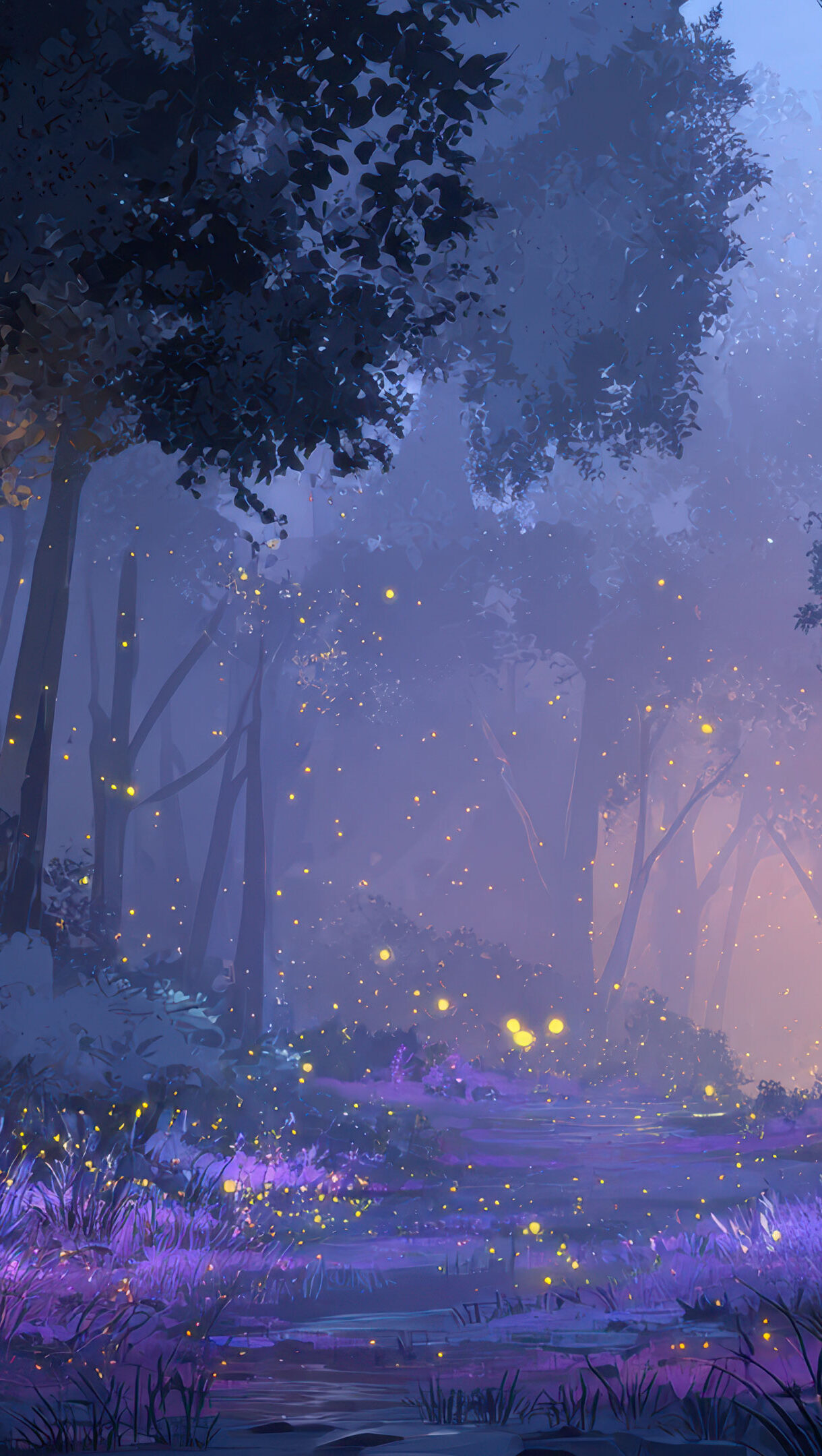 A magical 4K wallpaper featuring a mystical forest path at twilight. Golden fireflies illuminate the vibrant purple foliage, casting a serene glow through the hazy trees.