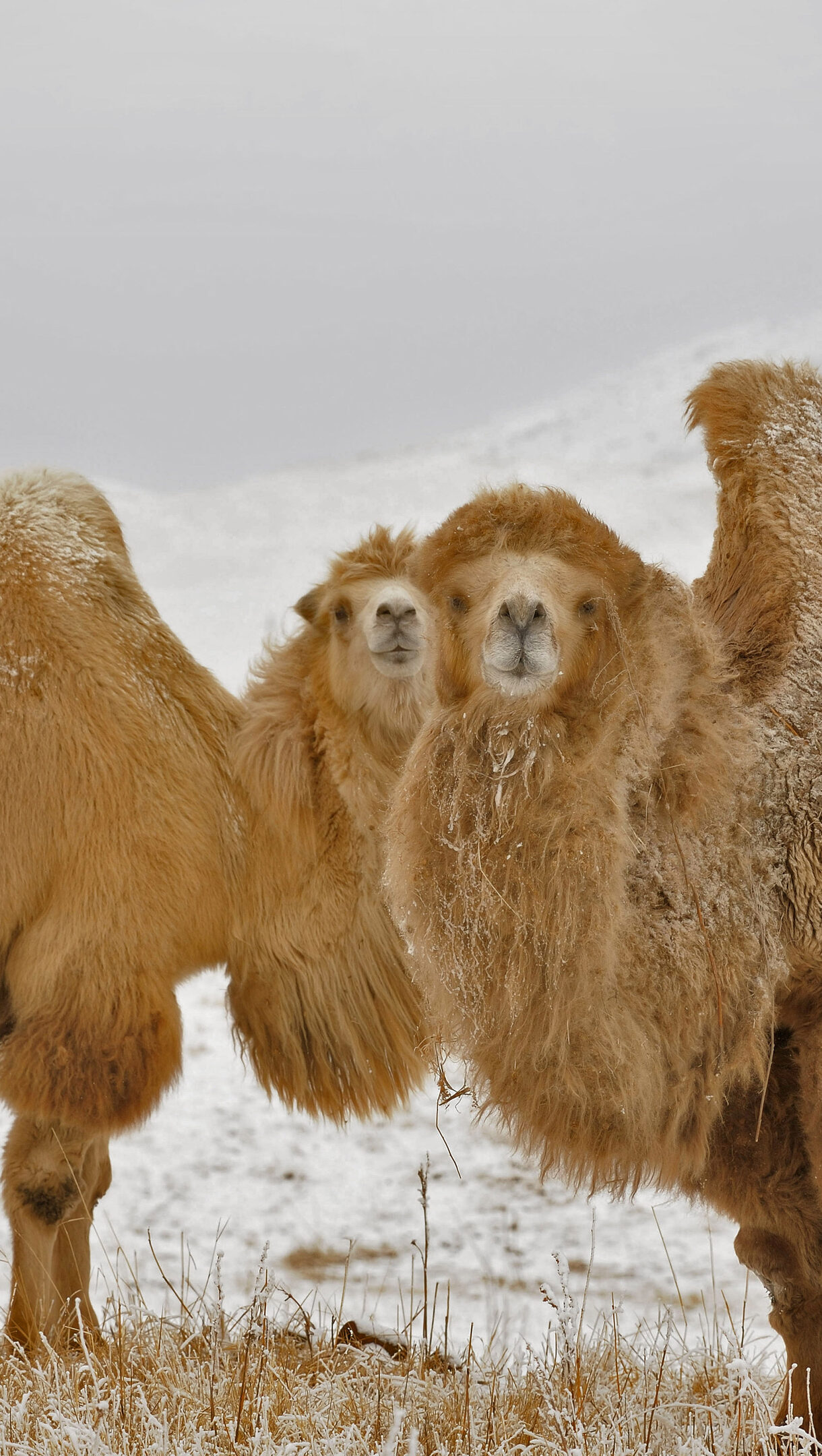 A majestic 4K wallpaper captures two hardy Bactrian camels standing prominently in a snow-covered landscape during a Kazakhstan winter. Their thick, shaggy golden-brown fur is beautifully dusted with glistening white snow, creating a stark yet compelling contrast against the muted, icy backdrop and highlighting their resilience.