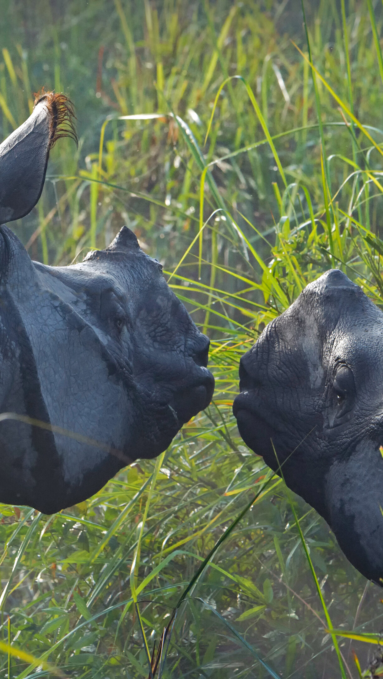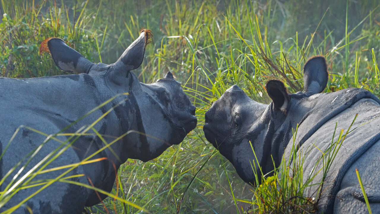 An intimate 4K wallpaper showing two Greater One-horned Rhinoceroses standing nose-to-nose in the tall, misty grass of Kaziranga National Park, India. Soft light illuminates the dew-kissed green blades and highlights the deeply textured, wet skin of the rhinos, conveying a peaceful yet powerful wildlife encounter.