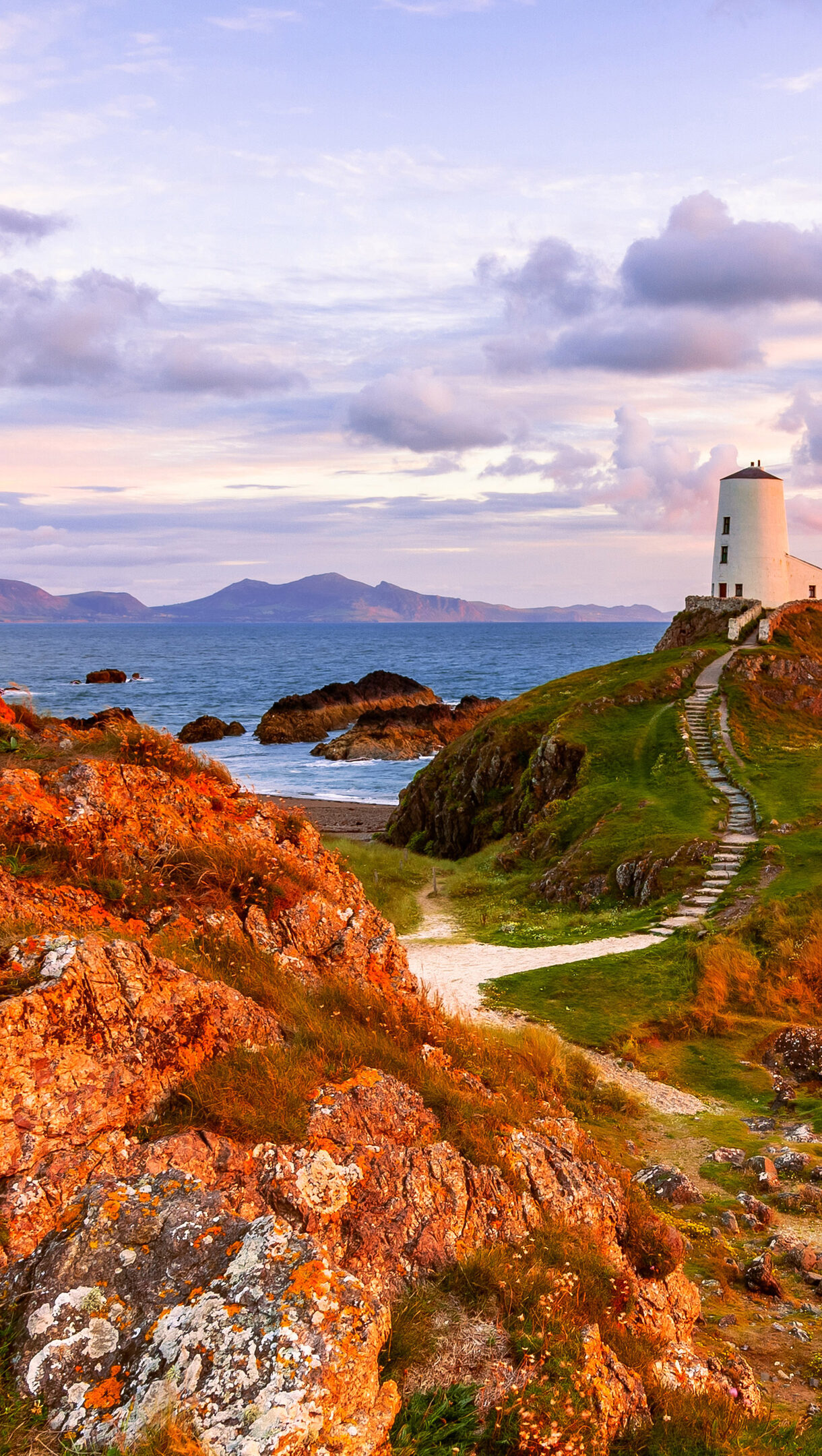 A breathtaking 4K wallpaper depicting Tŵr Mawr Lighthouse on Llanddwyn Island, Anglesey, Wales, nestled within a dramatic coastal landscape at sunset. The warm golden light of the sunset vividly illuminates the rugged orange-lichen-covered rocks and the winding path leading to the white lighthouse, creating a striking interplay against the soft pastel clouds and the deep blue sea.