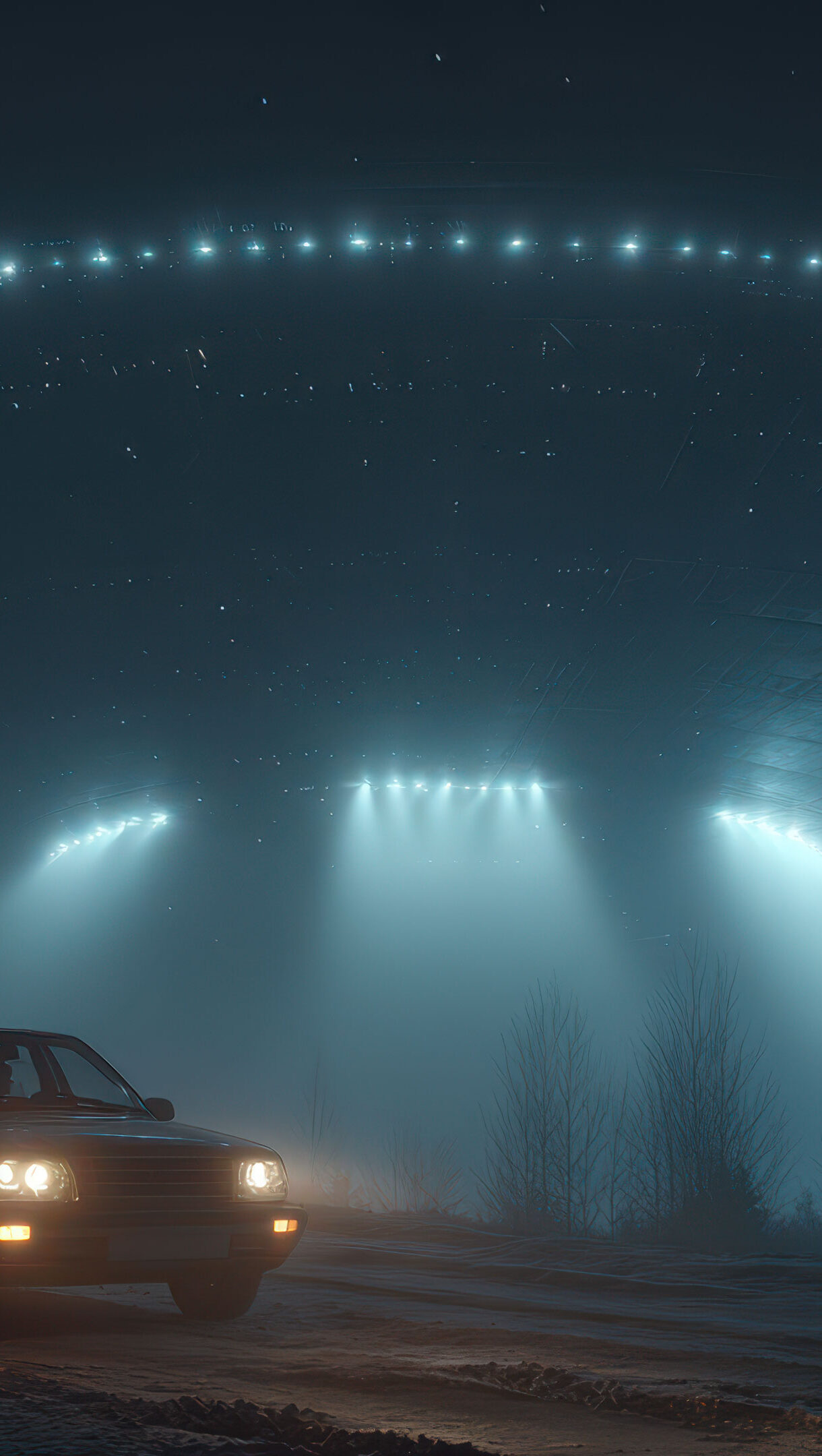 An eerie 4K wallpaper captures a vintage car parked on a dirt road at night, facing a colossal, illuminated UFO hovering in dense fog. The spaceship's radiant blue lights dramatically pierce the thick, swirling fog, casting an otherworldly glow over the desolate landscape and highlighting the car's small, isolated presence.