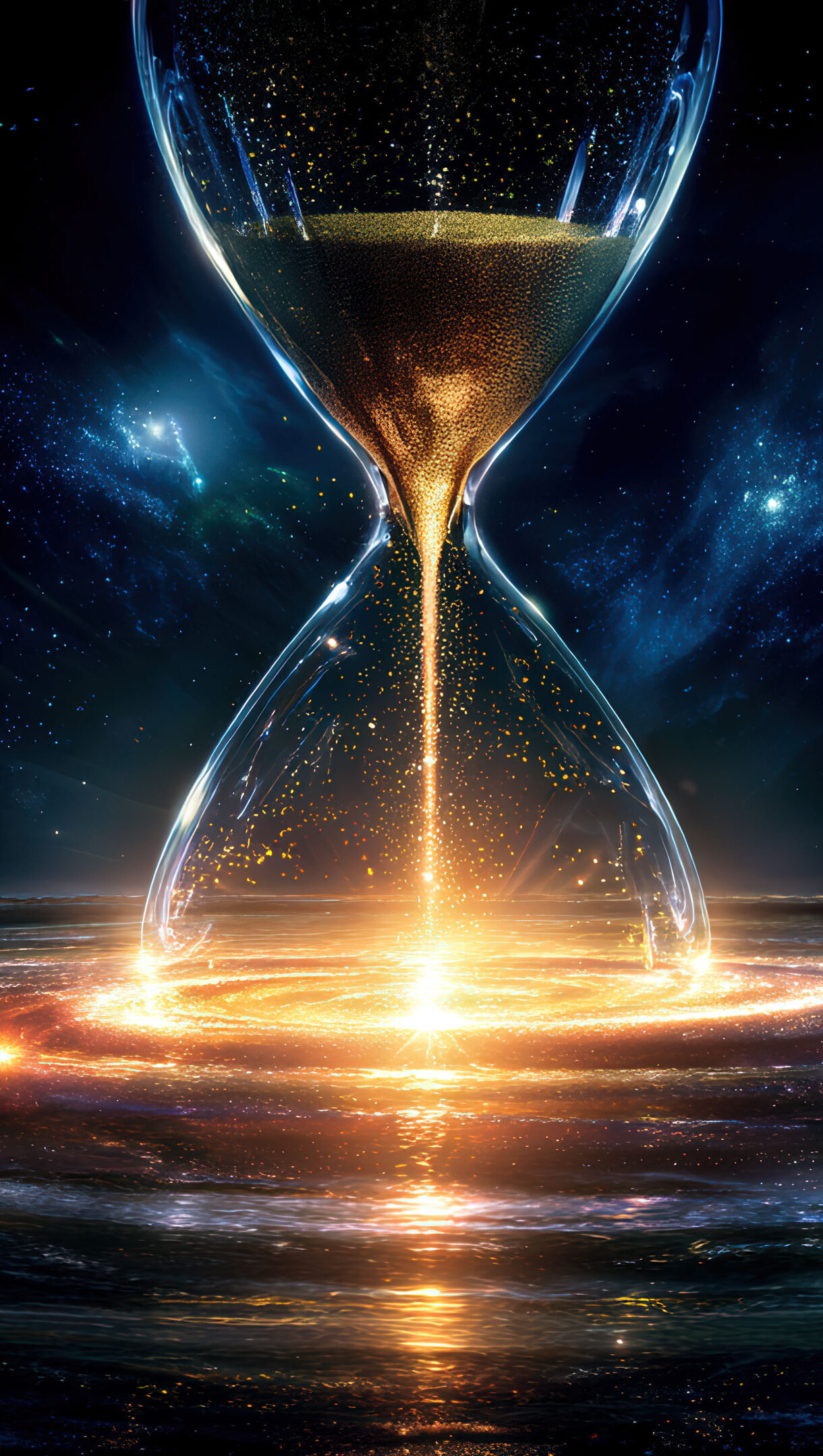 A mesmerizing wallpaper features a giant hourglass, its bulbs filled with swirling galaxies and countless stars, set against a backdrop of deep cosmic dust and nebulae. Light years of creation and destruction flow like sand, emphasizing the vastness and transient beauty of the universe within its confines.