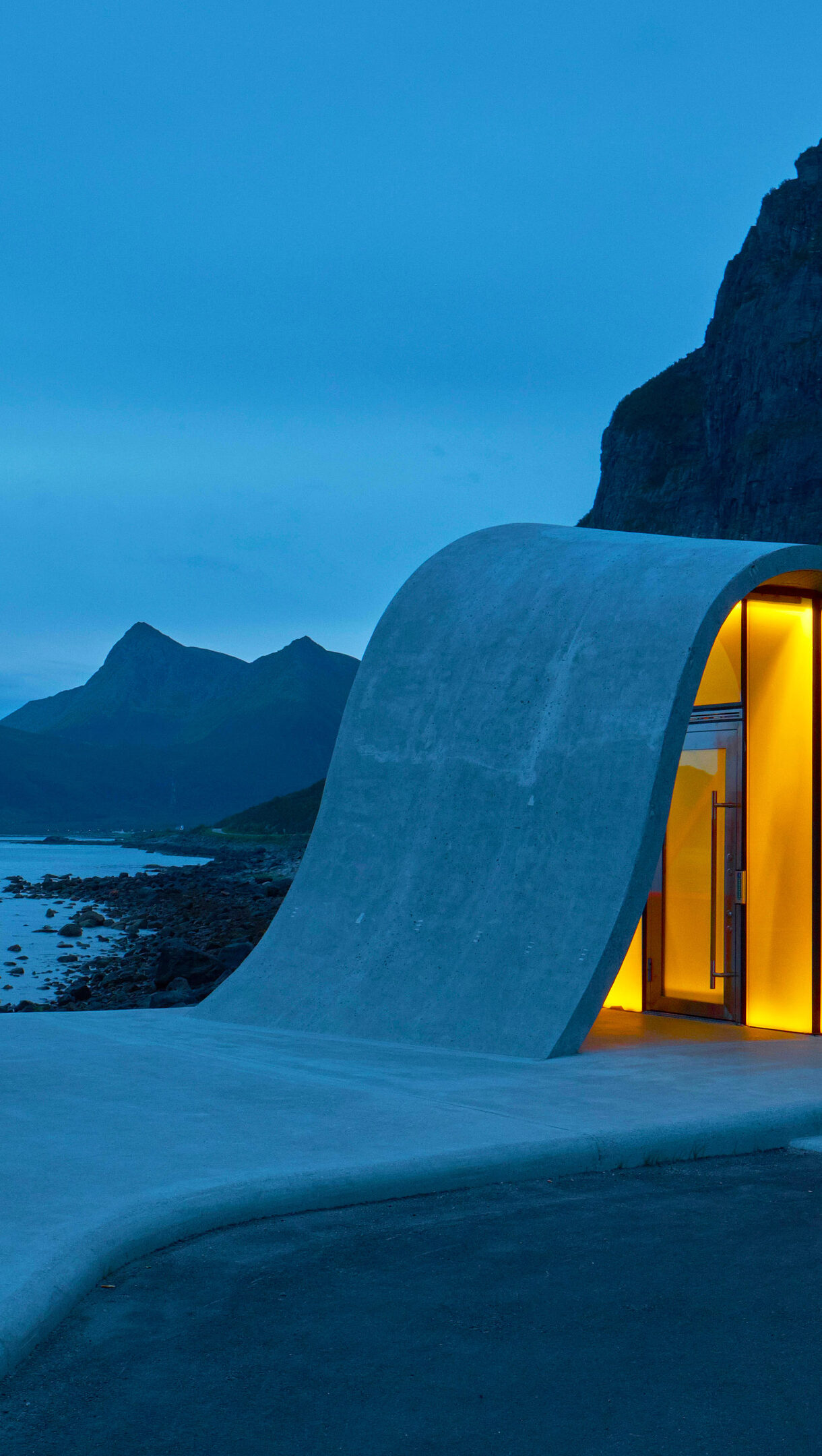 A captivating 4K wallpaper of the modern Ureddplassen Rest Area at night, nestled along Norway's Helgelandskysten Scenic Route. Its distinctive concrete structure glows with warm orange light against the serene blue twilight, reflecting softly on the calm water and silhouetted mountains.