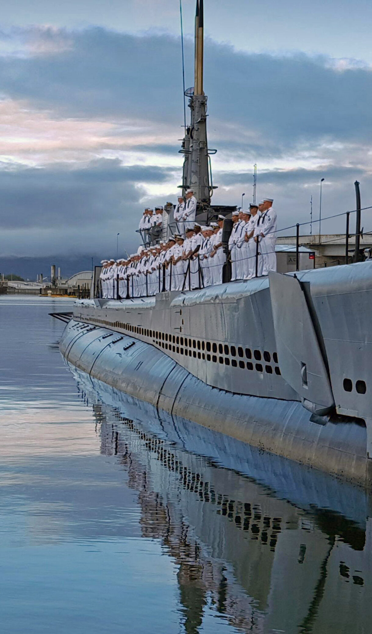 An evocative 4K wallpaper capturing US Navy sailors standing at attention on the deck of the USS Bowfin, a WWII Museum Submarine, docked in tranquil harbor waters. The calm surface beautifully reflects the vessel and the soft, cloud-streaked sky, enhancing the solemn and majestic atmosphere of this historic scene.