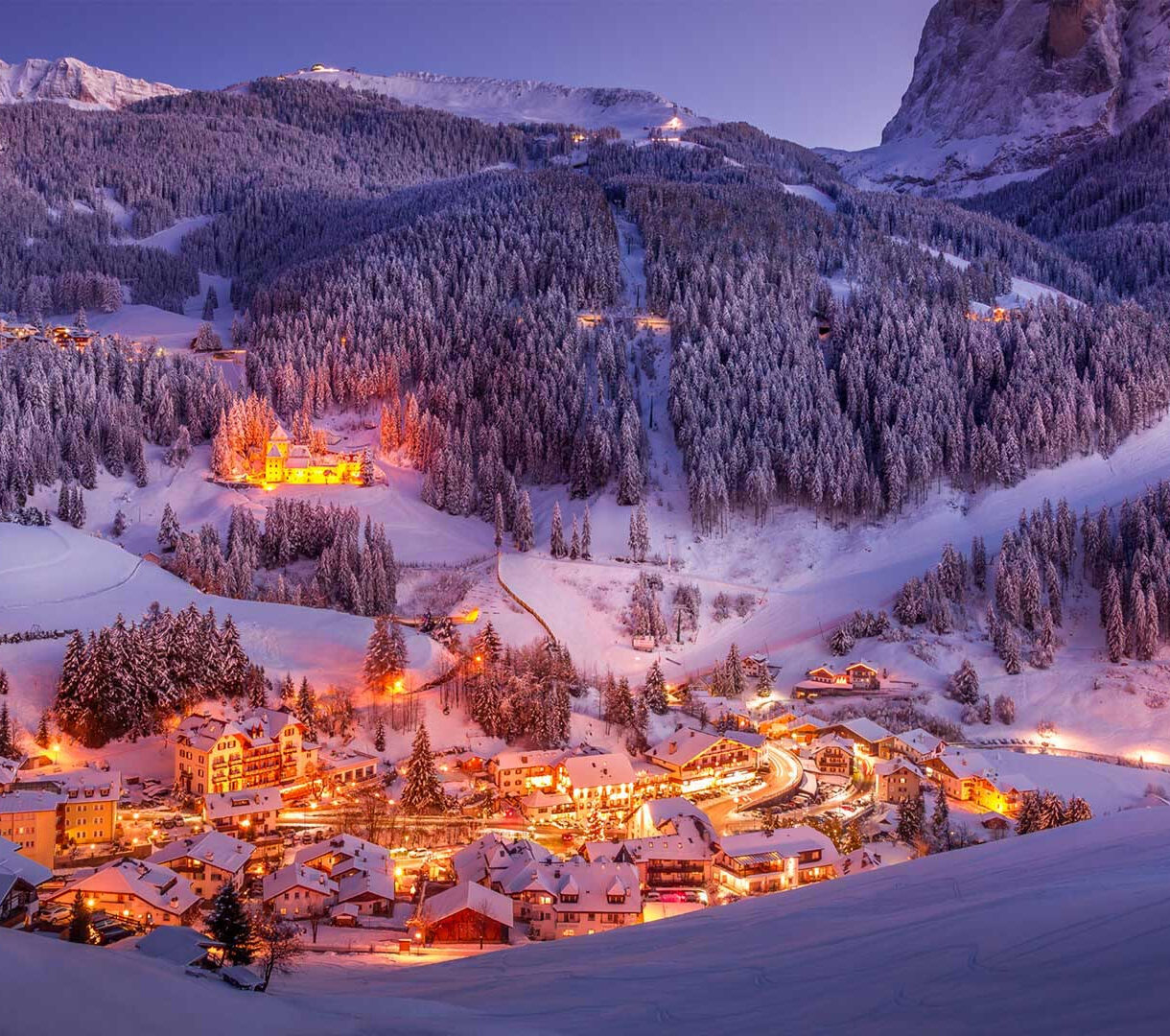 Val Gardena Winter Village Sunset Dolomites Wallpaper