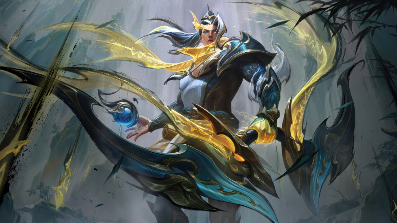 A captivating 4K wallpaper showcasing Varus in his majestic Calligraphia Skin from LoL Wild Rift, dynamically posed against a misty, abstract backdrop featuring sweeping calligraphic strokes and dark bamboo silhouettes. Intricate gold and teal armor and a formidable bow are accented by glowing golden ribbons and a luminous blue orb, creating a powerful and elegant composition.