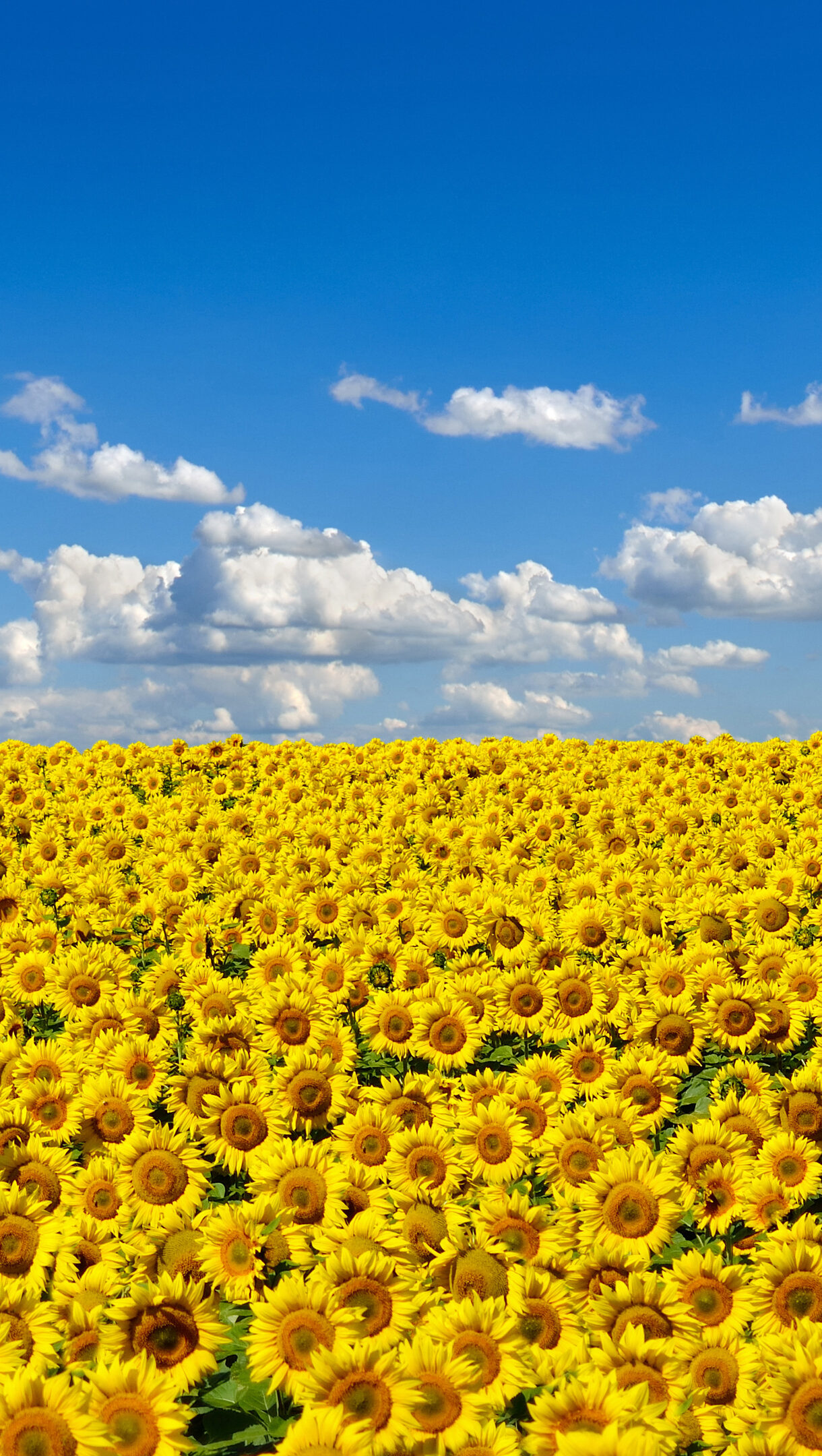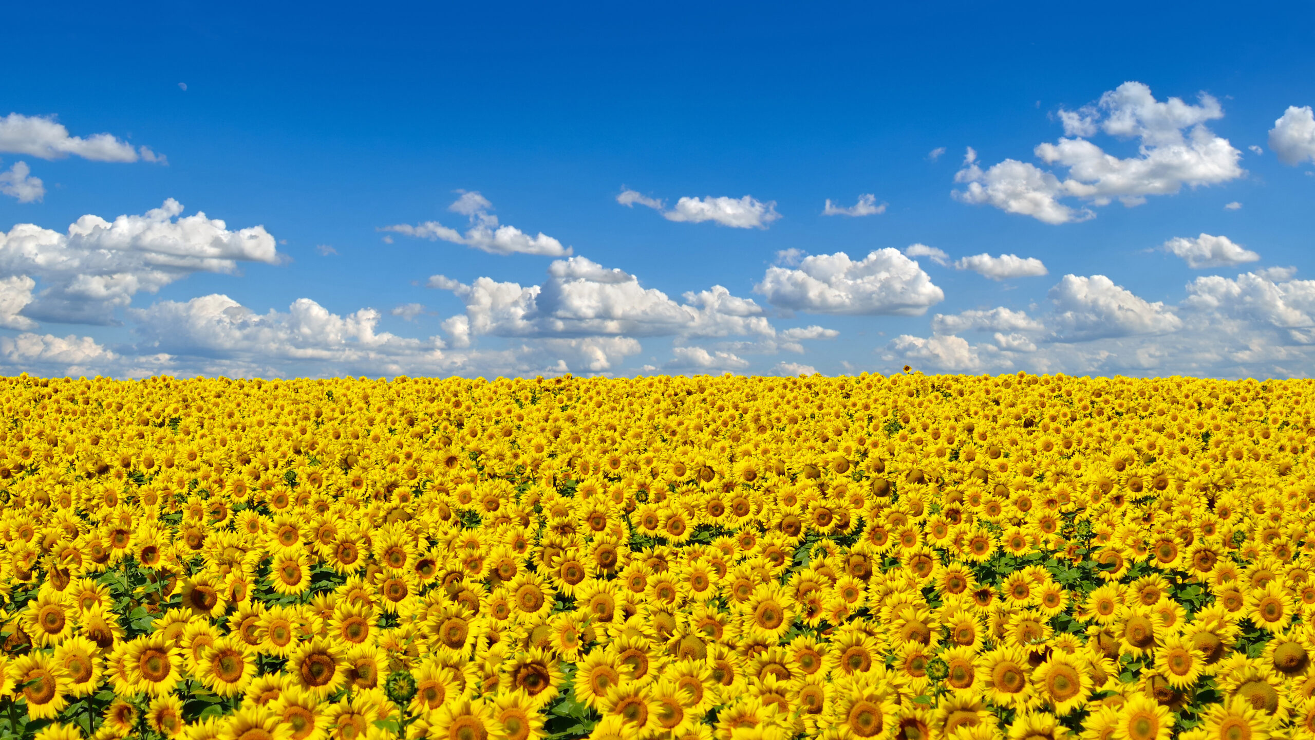 A magnificent 4K wallpaper displaying a vast sunflower field, the national flower of Ukraine, stretching under a brilliant blue sky. The vibrant yellow blooms bask in bright sunlight, creating a striking contrast with the scattered white clouds above.