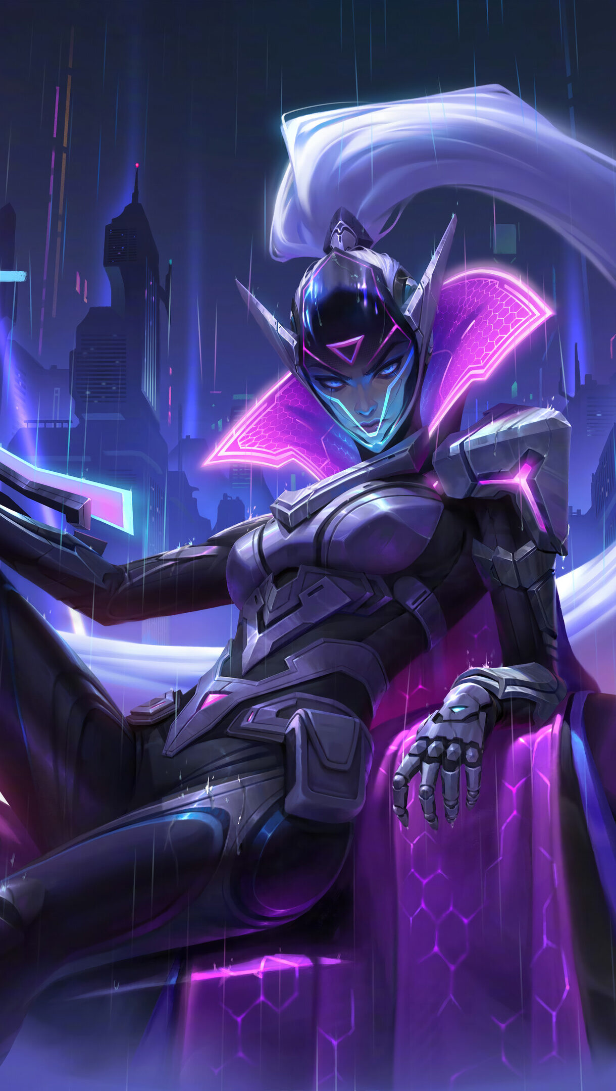 A stunning 4K wallpaper features the cybernetically enhanced Vayne, from League of Legends, seated commandingly amidst a dark, rain-slicked futuristic city. Vibrant neon pinks and blues illuminate her sleek armor and the imposing, rain-streaked skyline, creating a dramatic, high-tech mood.