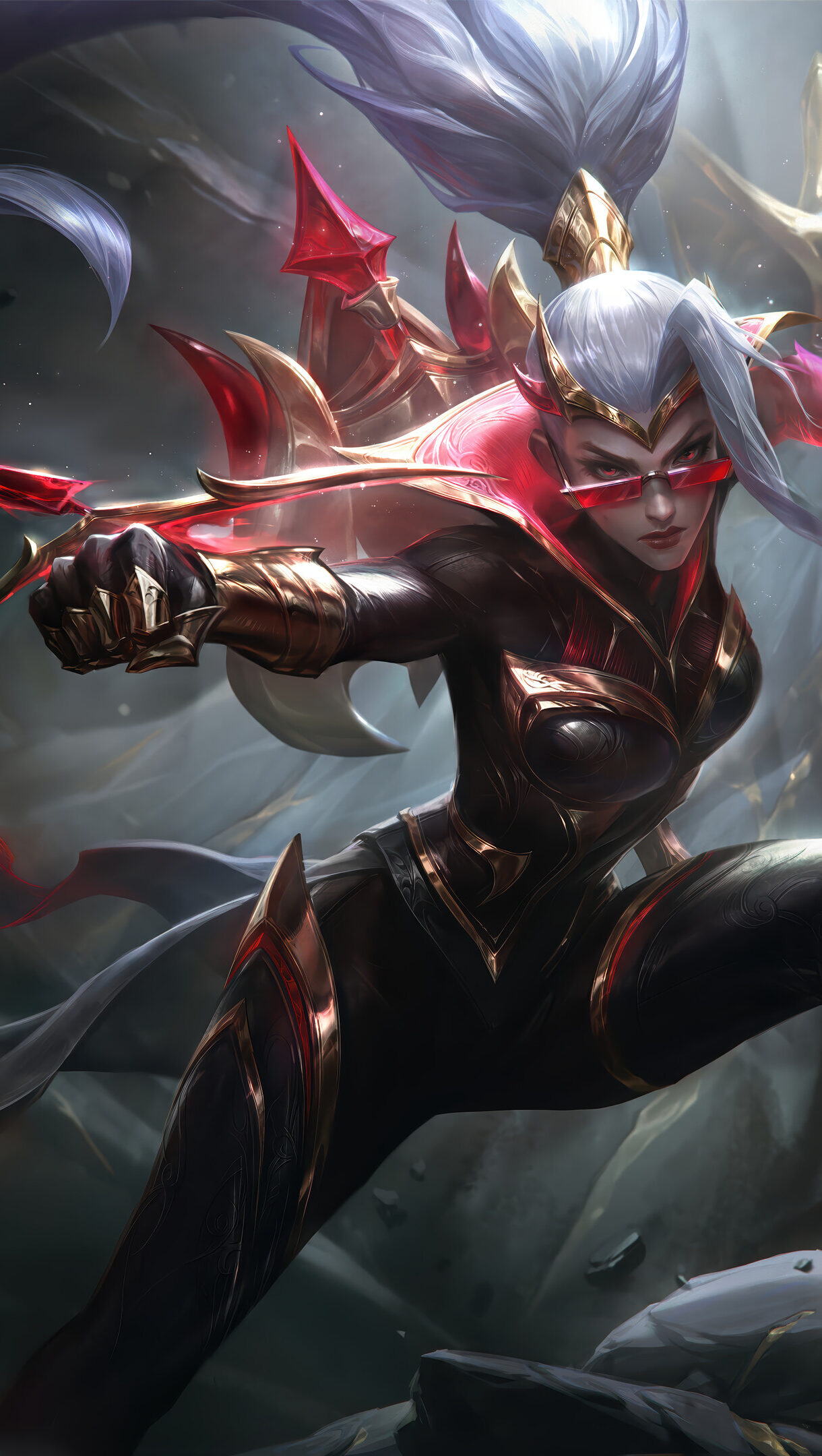 A striking 4K wallpaper featuring the fierce Vayne in her Risen Legend skin, poised for action amidst dark, fractured ruins. The intense red glow from her visor and left hand pulsates against the muted, gold-veined rock formations, conveying an aura of formidable power.