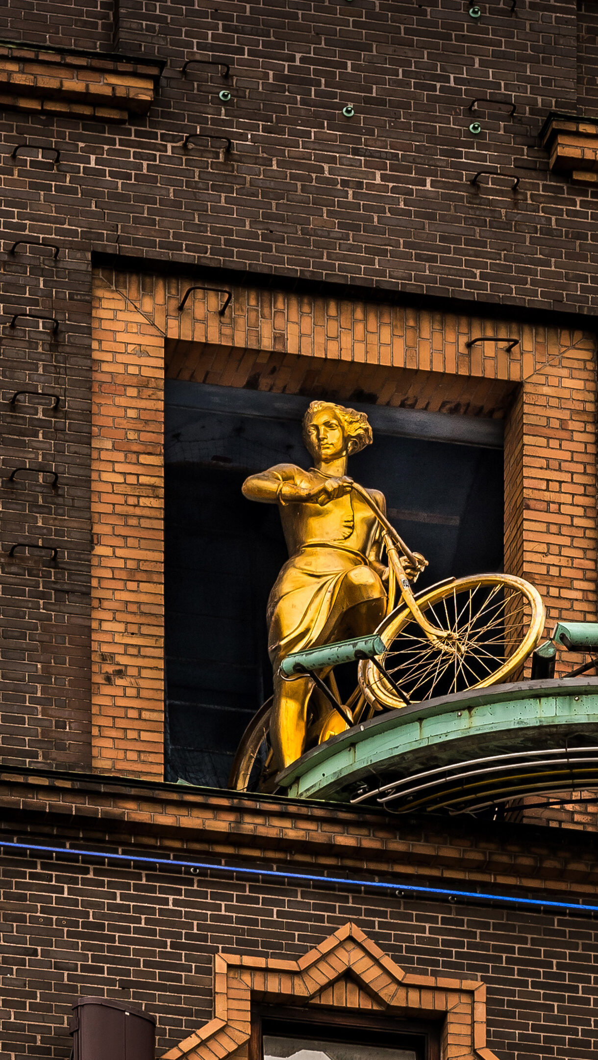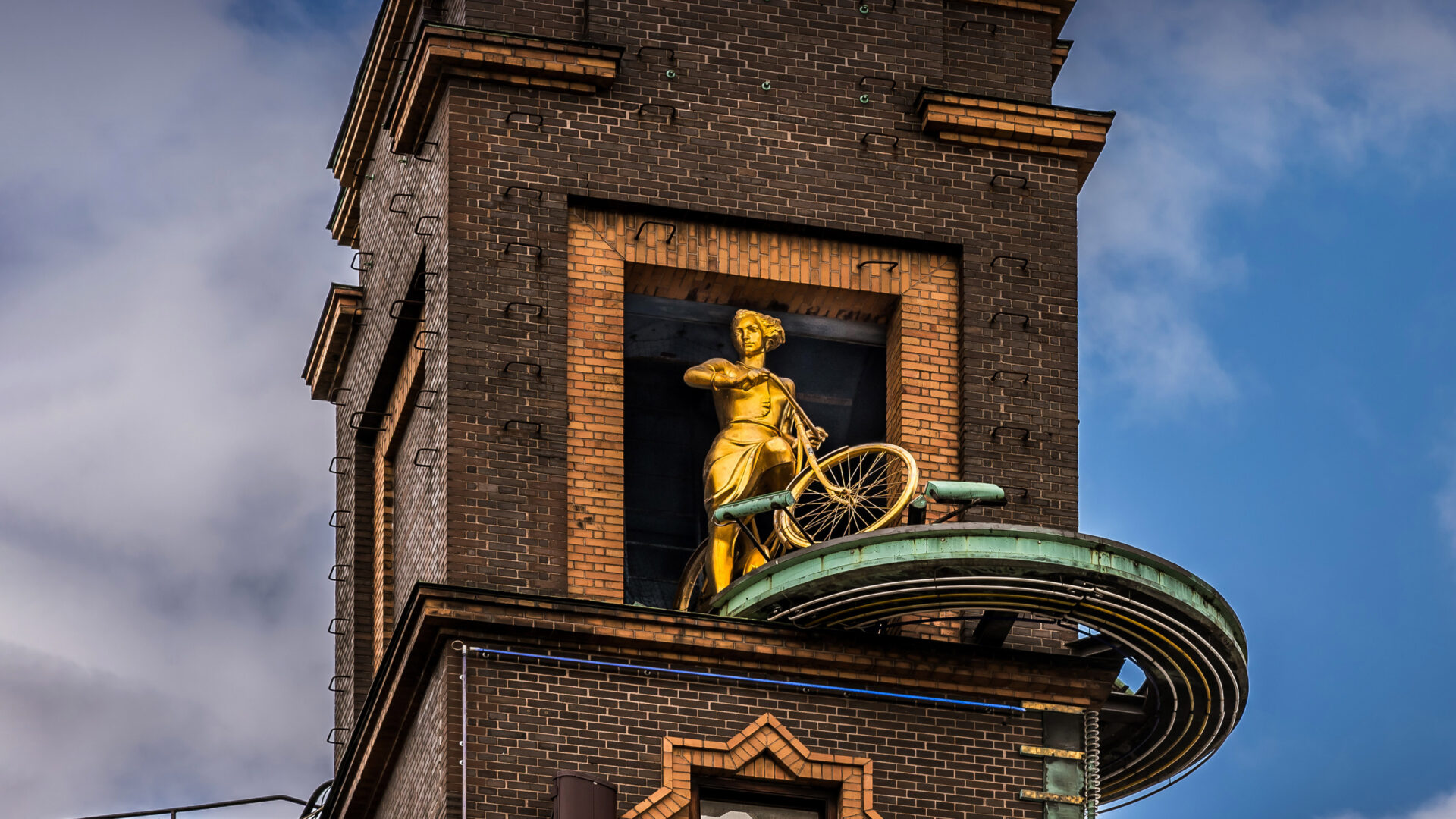 A captivating 4K wallpaper showcasing the iconic Vejrpigerne (Weather Girls) Golden Bicycle Statue perched high on a dark brick tower in Copenhagen. The statue's brilliant golden sheen gleams against the deep blue sky, juxtaposed with the weathered dark bricks and verdigris-patinaed circular platform, creating a timeless and elegant mood.