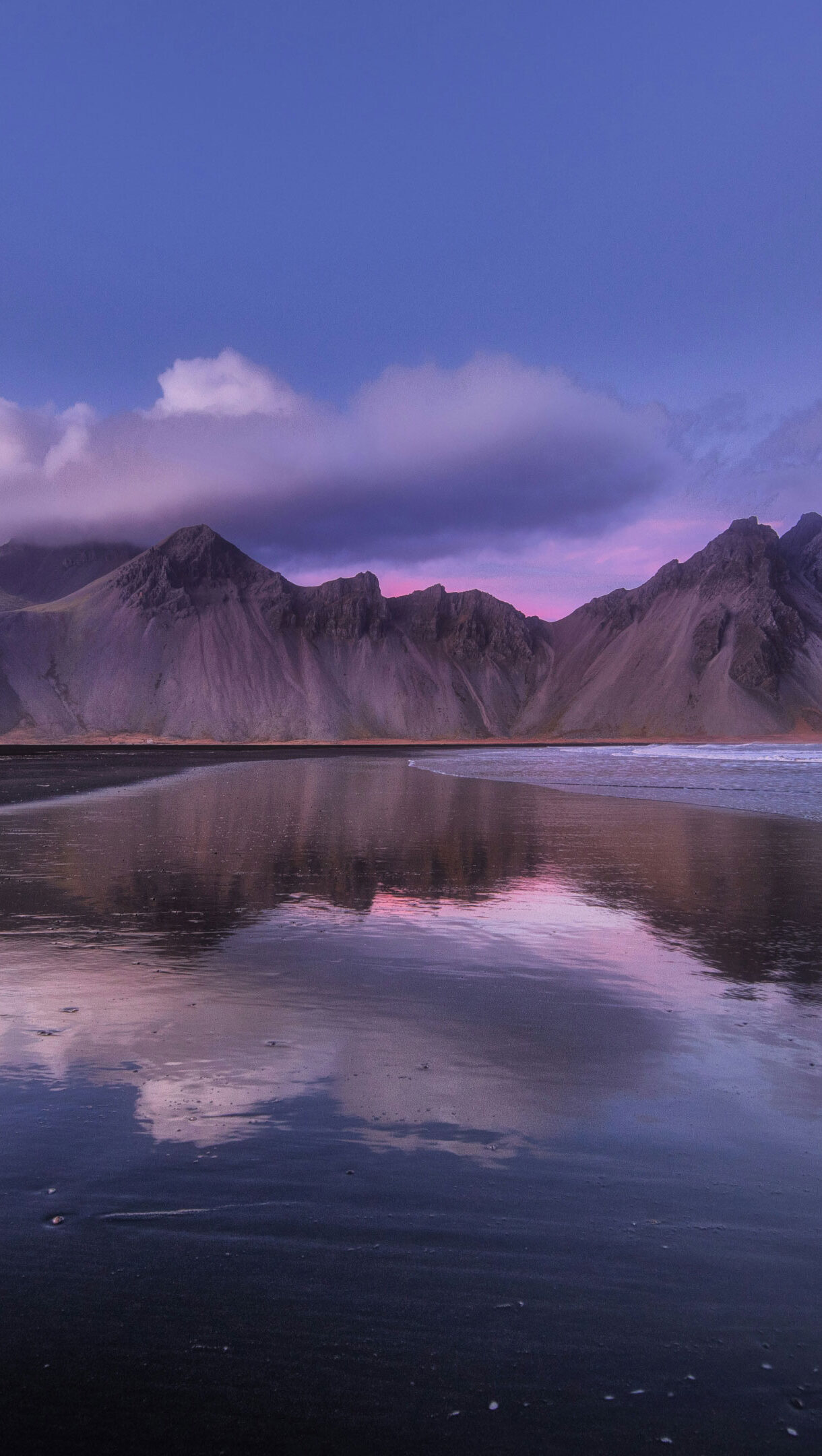 A mesmerizing 4K wallpaper capturing the majestic beauty of Vestrahorn Mountain reflected in calm waters. The tranquil scene depicts the towering mountain mirrored perfectly in the serene lake, showcasing the breathtaking landscape of Iceland. Ideal for adorning your desktop or mobile screen with nature's splendor.