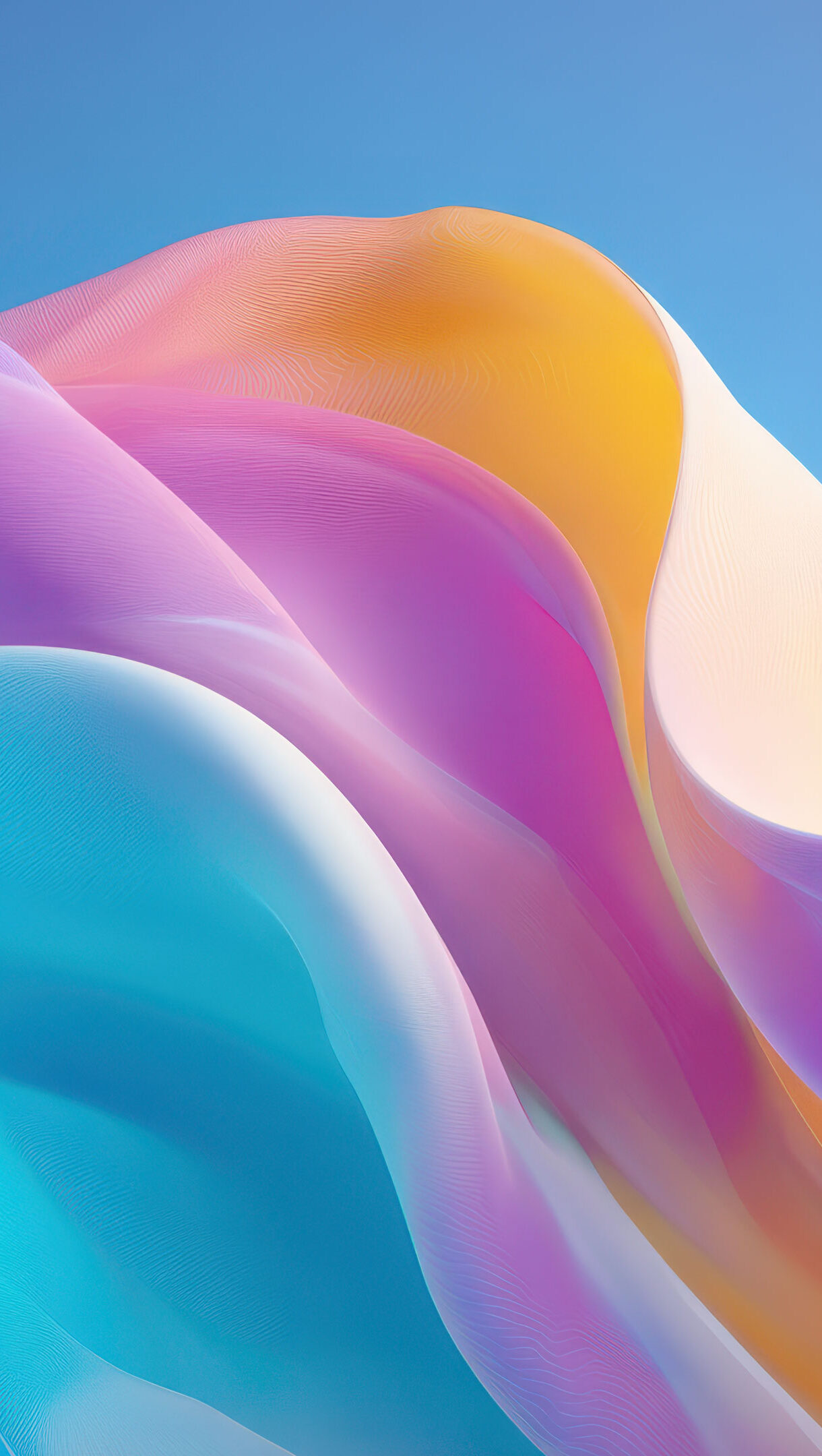 An exquisite 4K wallpaper showcasing abstract, flowing waves of translucent silk-like fabric in vibrant pastel colors against a soft blue sky background. The forms gently undulate, revealing delicate textures and a luminous interplay of teal, lavender, pink, and golden hues, creating a serene and ethereal mood.