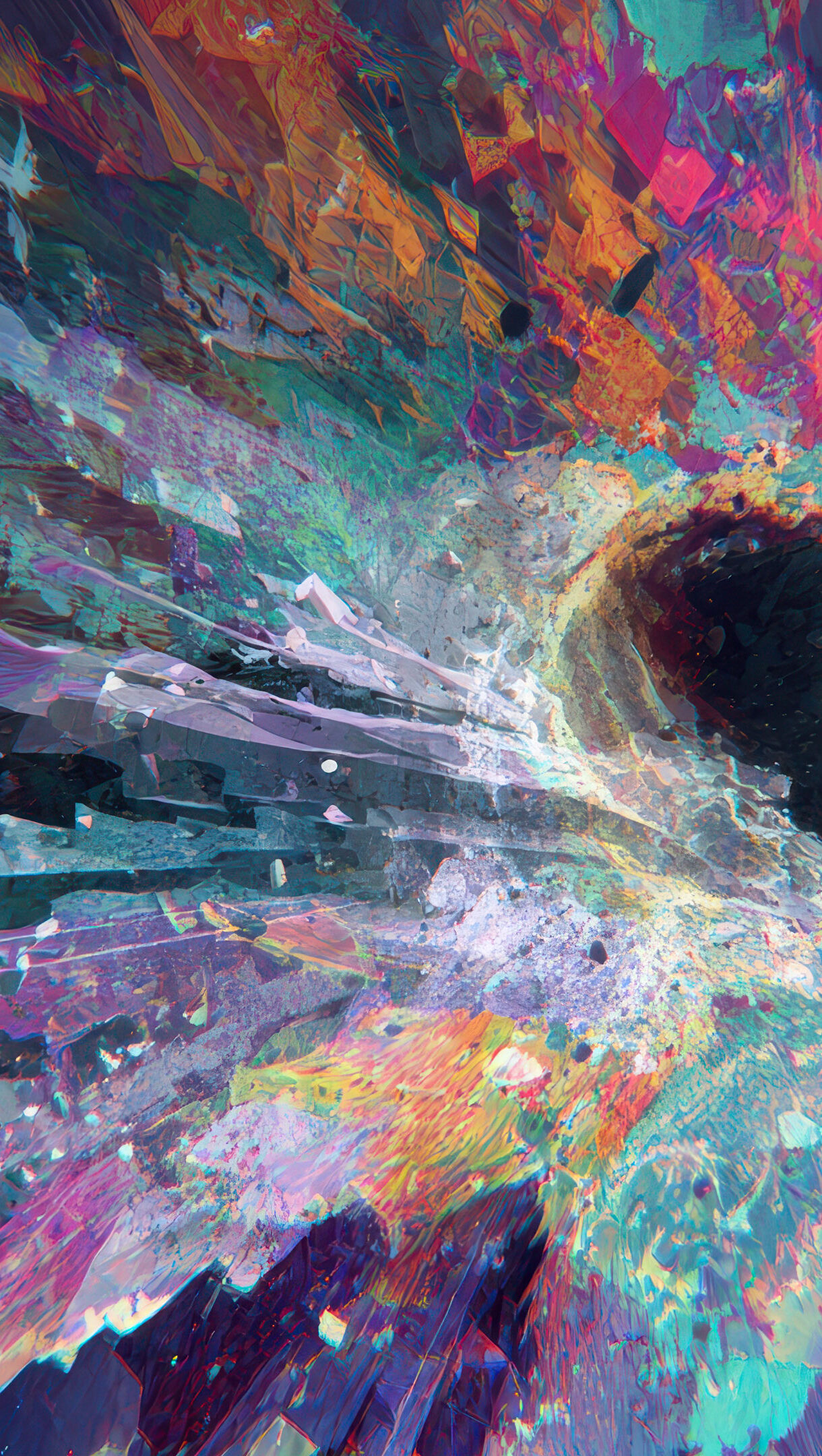 A captivating 4K wallpaper showcasing a vibrant abstract digital art explosion, where a central dark void violently propels a kaleidoscope of sharp, multi-hued shards outwards. The intense interplay of radiating fractured forms and shifting colors like pink, orange, and teal creates a mood of chaotic beauty and powerful energy.