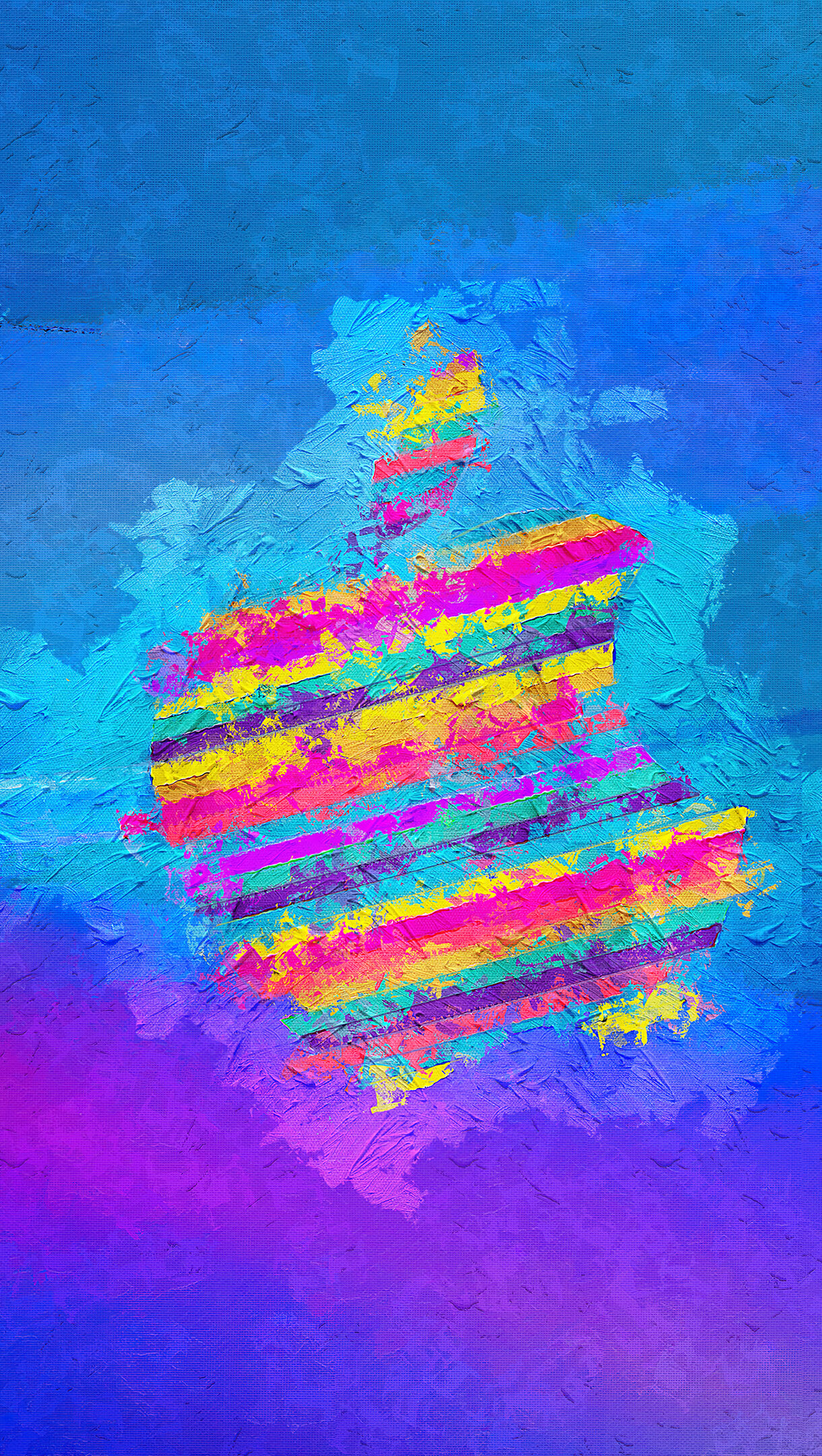 A captivating 4K wallpaper presents a vibrant Apple logo, rendered as abstract digital art, centered against a painterly backdrop of blues and purples. The logo bursts with horizontal bands of pink, yellow, and magenta, creating a dynamic contrast against the deep, textured hues of the blue and purple gradient background, evoking an energetic and modern artistic mood.