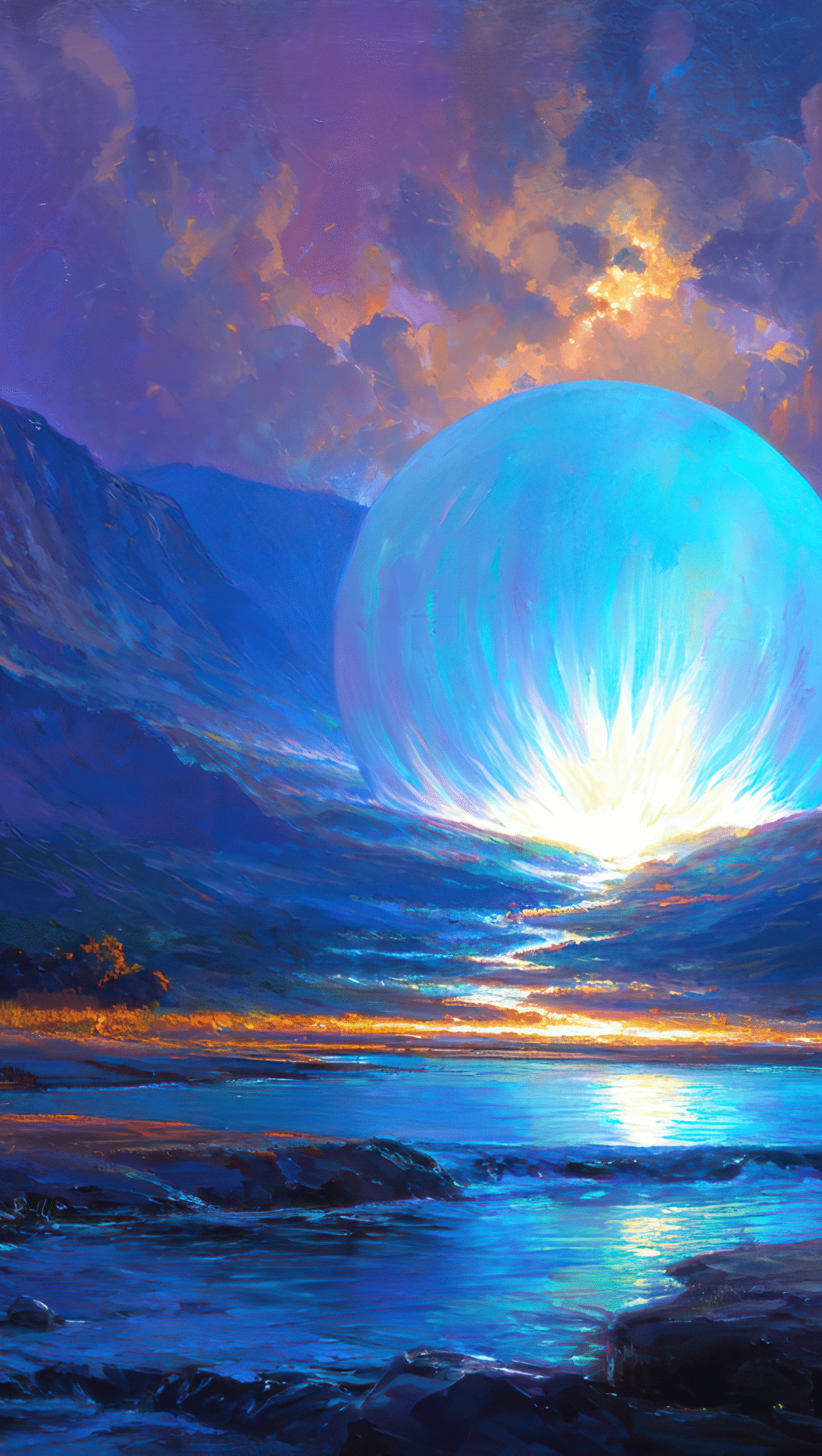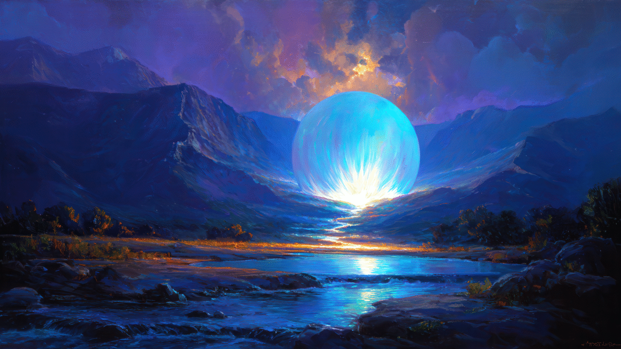 A magical 4K wallpaper of a massive, glowing blue orb nestled within a dark, majestic mountain range, overlooking a serene body of water. Its radiant light casts a vibrant turquoise glow across the water, contrasting dramatically with the deep blues of the mountains and the fiery orange clouds above.