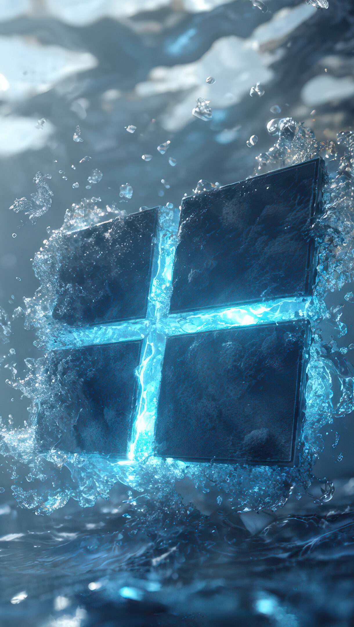 A vibrant 4K wallpaper showcasing a glowing Windows logo submerged deep underwater amidst rising bubbles. Its iconic blue light intensely illuminates the dark, turbulent water, emphasizing the dynamic interplay of light and texture around the logo.