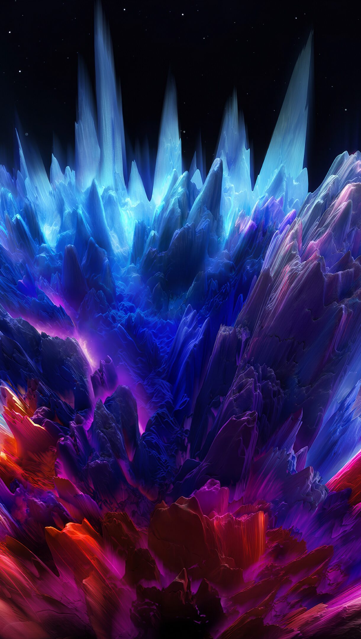 A captivating 4K wallpaper erupts with a vibrant cosmic color burst, manifesting as sharp, crystalline forms against a dark, starry void. The explosion transitions from intense blue and purple spikes at the top to fiery reds and oranges at the base, creating a sense of powerful, dynamic energy.