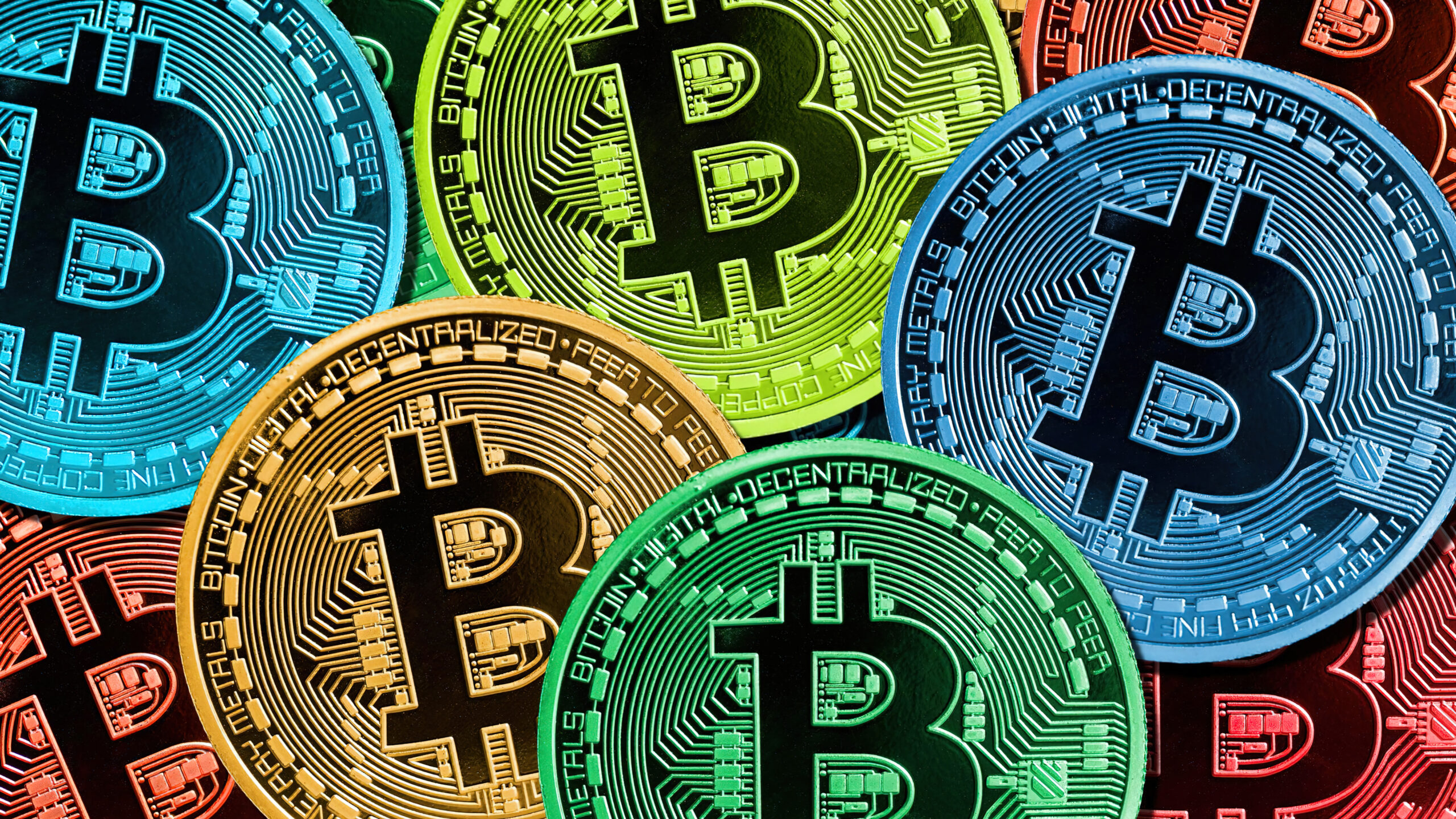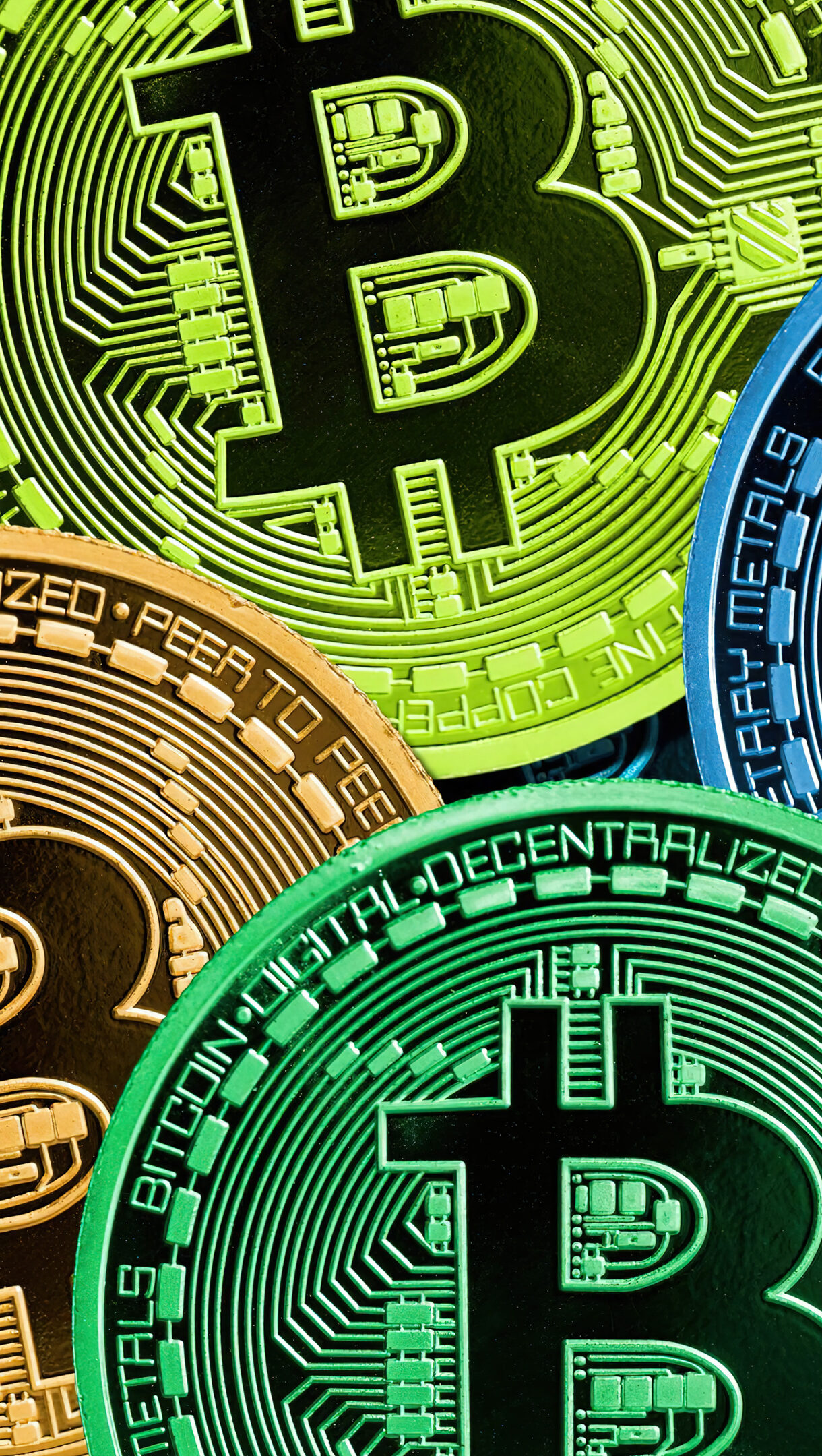 A dynamic 4K wallpaper presenting a dense, overlapping array of vibrant digital Bitcoin cryptocurrency coins, each featuring intricate blockchain circuit patterns. The varied, luminous hues of blue, lime green, gold, and red powerfully highlight their metallic textures and intricate circuitry, creating an energetic and futuristic mood.