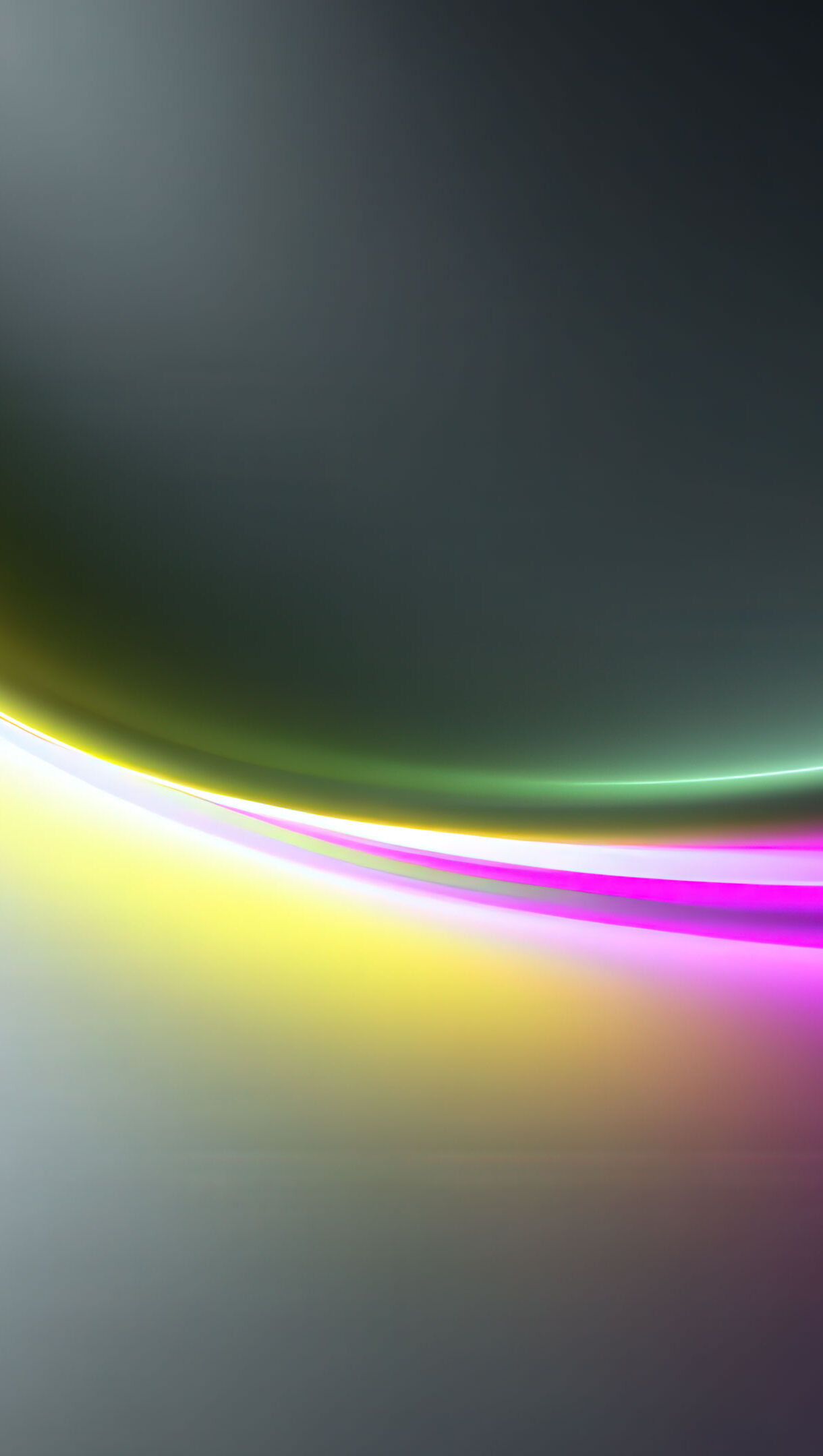A vibrant, abstract light swirl in rich yellow, glowing green, and electric magenta arcs gracefully against a gradient of dark gray to bright white, creating a dynamic and modern visual.