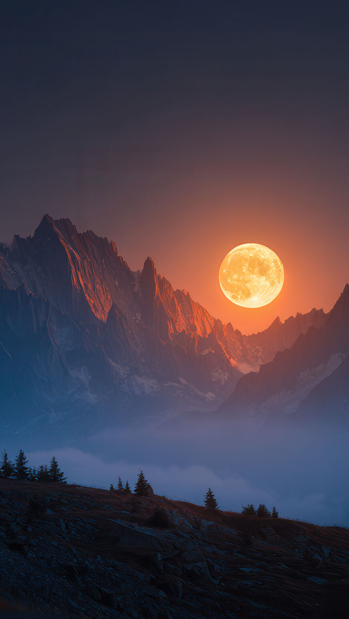 A captivating 4K wallpaper presenting a colossal, glowing orange moon positioned just above a jagged range of dark, majestic mountains at twilight. The moon's intense amber light dramatically backlights the central mountain peaks, making their contours glow warmly against the cool, dark blue and purple hues of the surrounding sky and shadowed landscape, evoking a sense of awe and mystery.