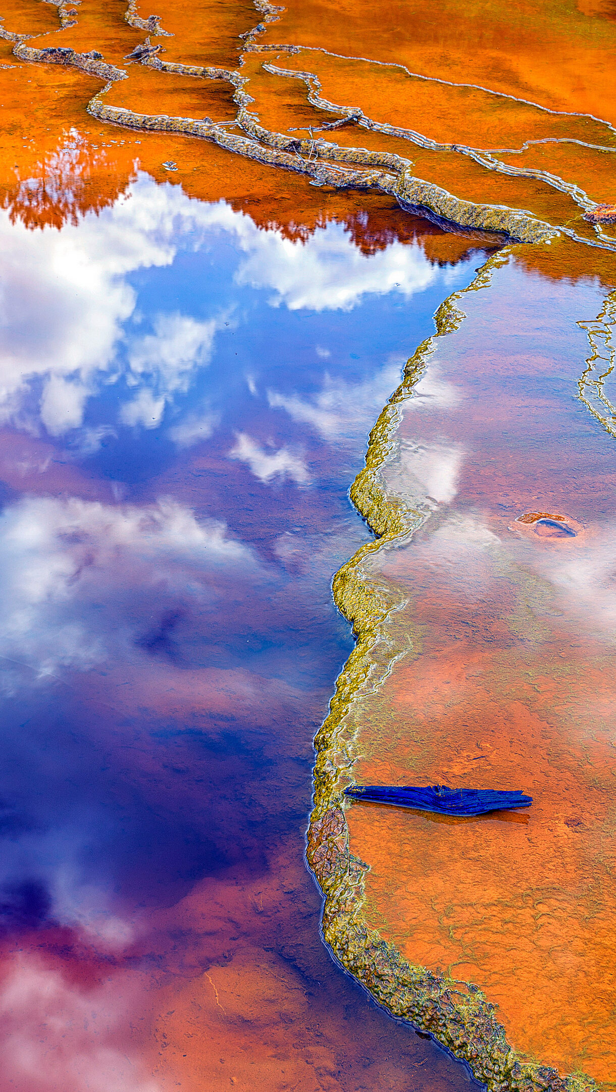 A dynamic 4K wallpaper showcases a body of vibrant orange water, vividly reflecting a brilliant blue sky adorned with white clouds. The striking interplay between the deep orange surface and the clear azure reflections, along with the detailed organic patterns, evokes a surreal and captivating natural landscape.