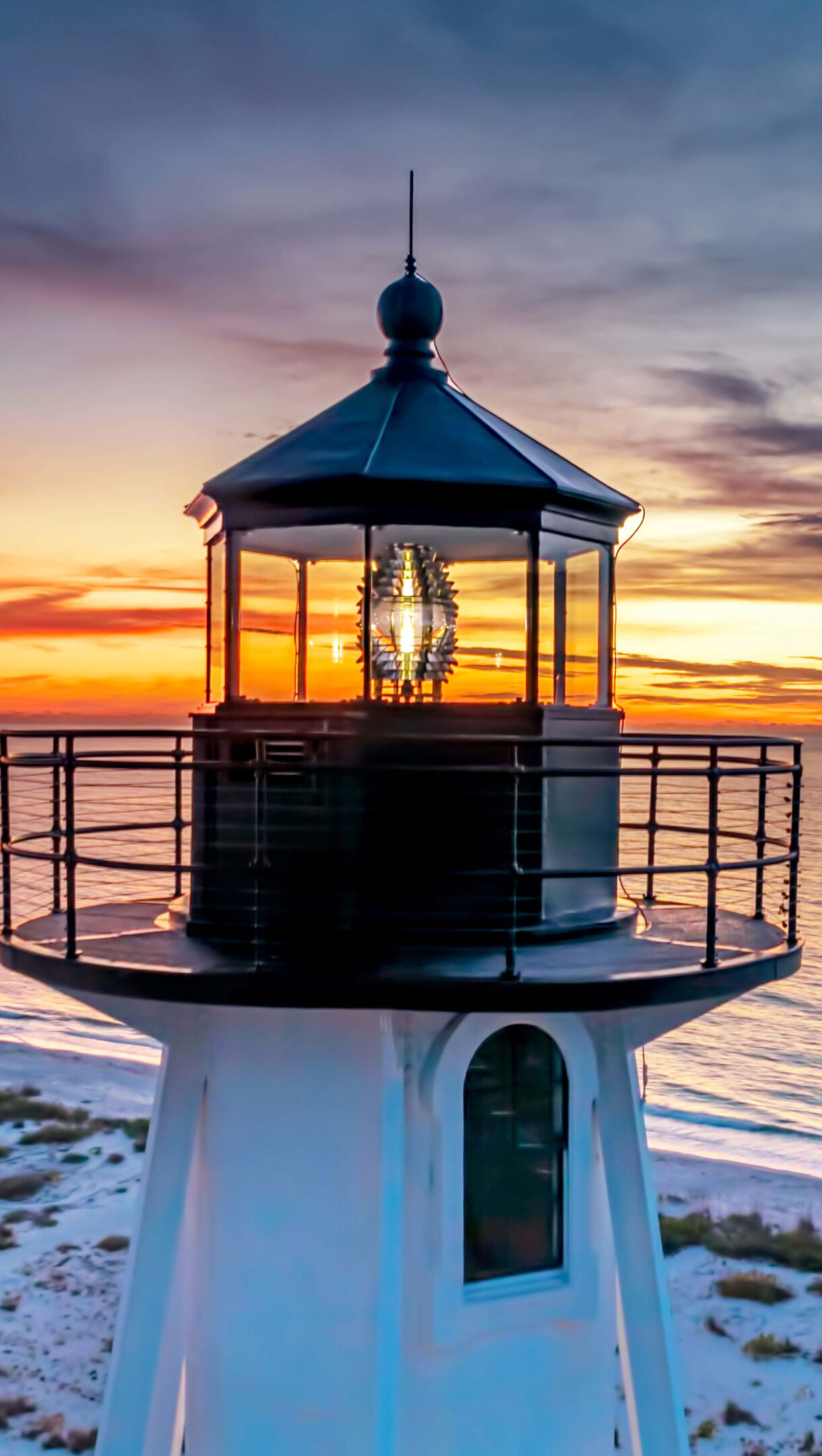 A vibrant 4K wallpaper showcasing the Gasparilla Island Rear Range Light standing prominently on a white sand beach at sunset. The scene is bathed in the dramatic hues of the vibrant sunset, with fiery oranges and deep blues reflecting across the tranquil ocean and highlighting the lighthouse's beacon.